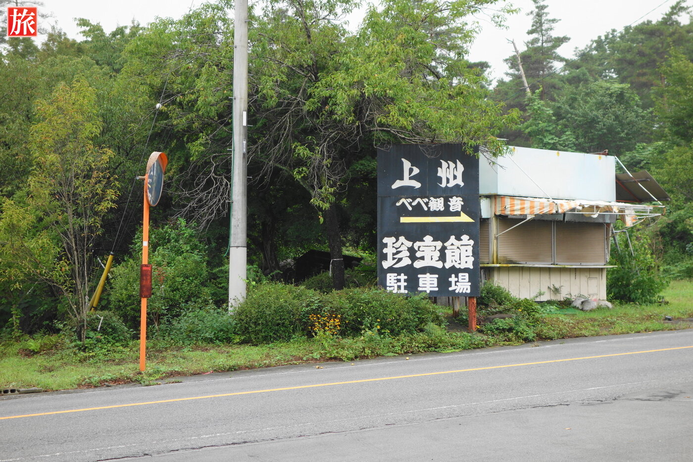 上毛三山パノラマ街道を水澤観音・伊香保温泉方向に進むと、看板の右側に駐車場があります。IC方向の看板。珍宝館の駐車場看板です。駐車場にあるトイレです。