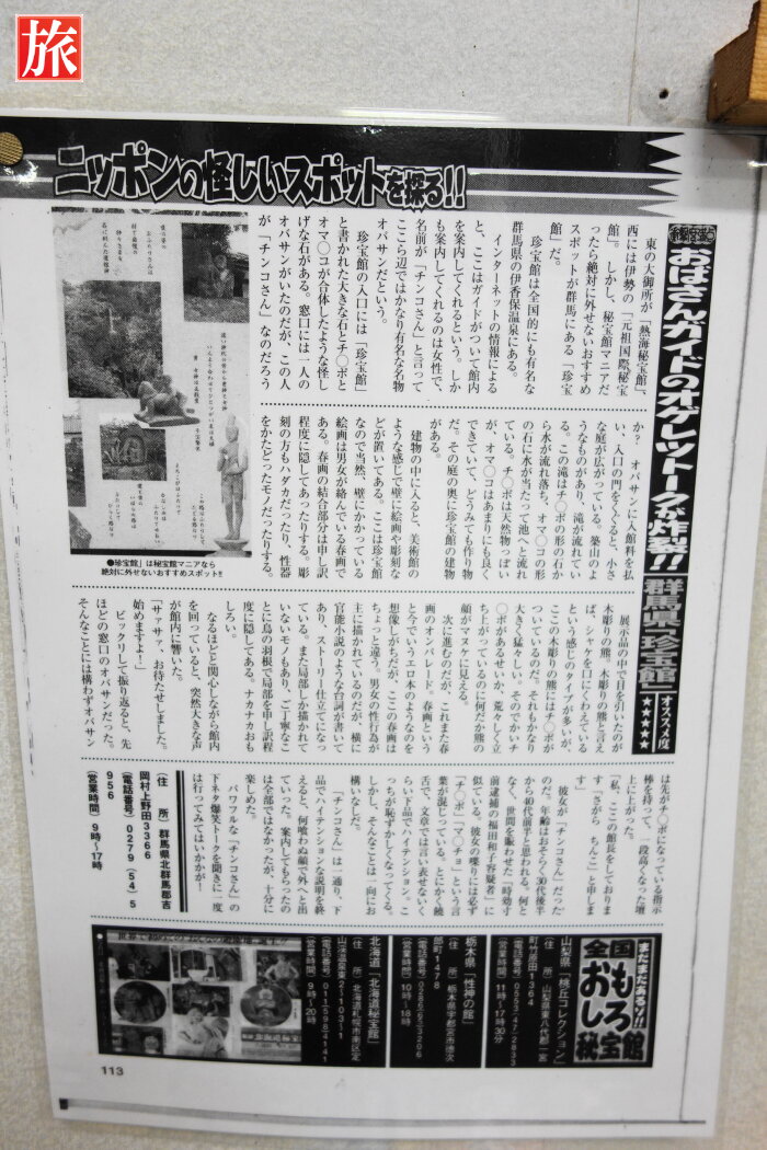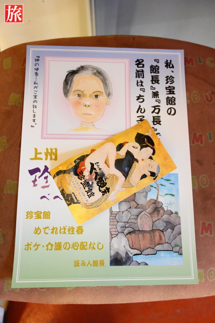 案内人の名物館長が有名です。ストレートな表現をするエロテックがテーマの館長でした。展示されている物は、色気たっぷりなものから自然が創り出す物など多彩です。珍スポットということで立ち寄ってみました。熱海の秘宝館などとは異なり写真撮影はOKでした。画像によってはボカシを入れてありますがご了承ください。