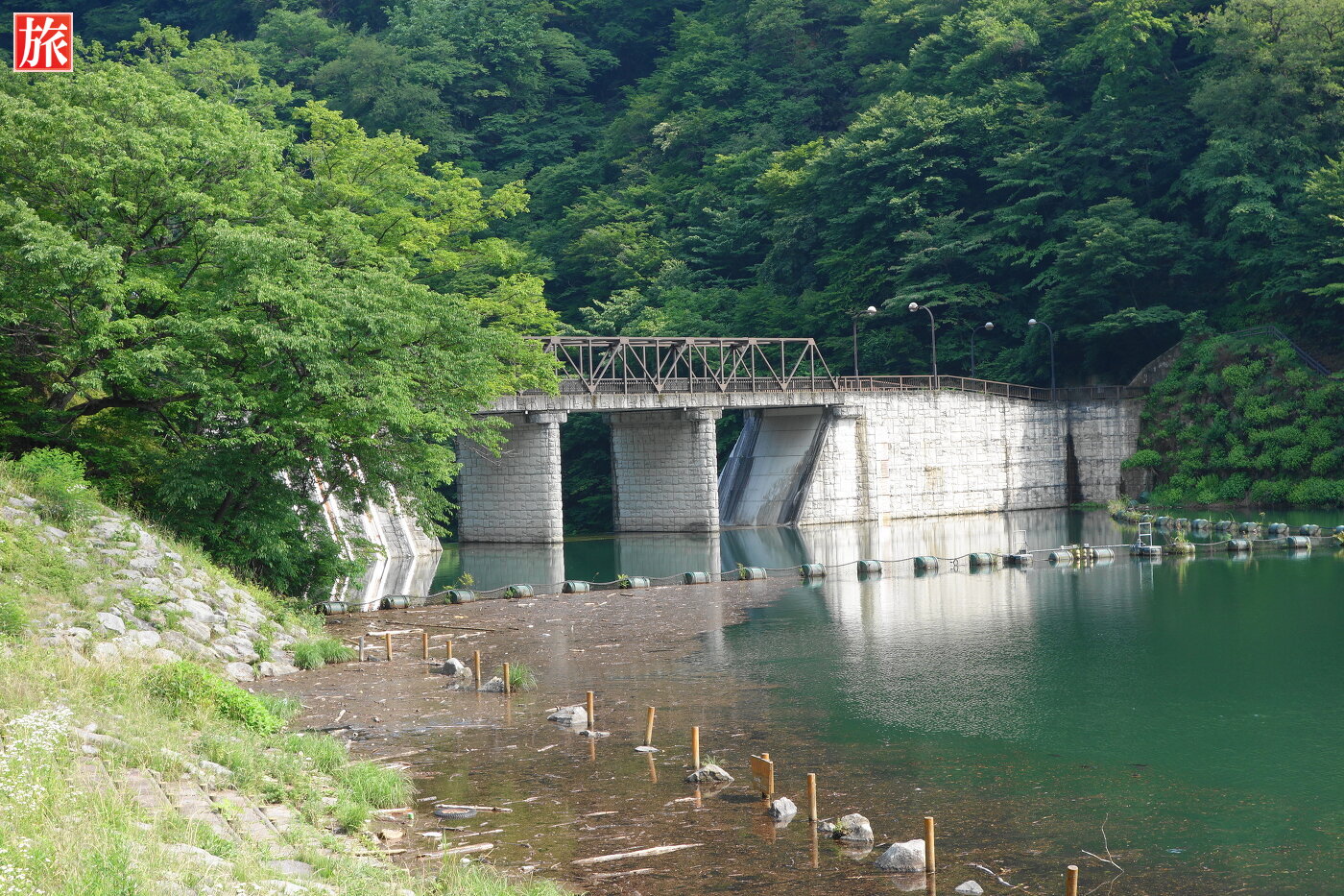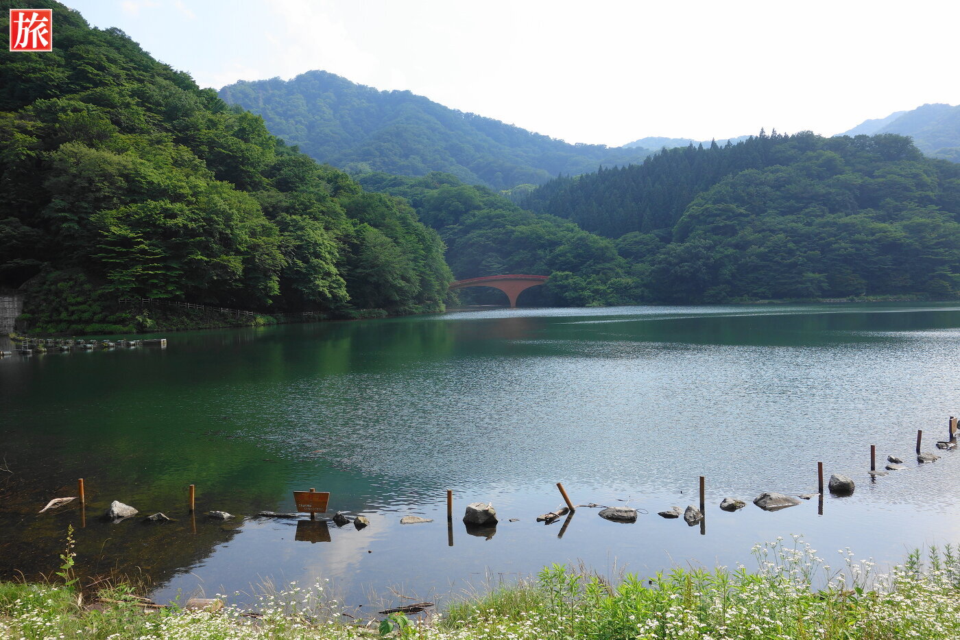 中尾川と碓氷川の合流点を堰き止めて造った人工湖で、アプトの道沿いにあり湖畔が整備され、家族連れにも人気があります。国有林に囲まれた湖畔には約1.2kmの散策道があり、約20分で一周できます。