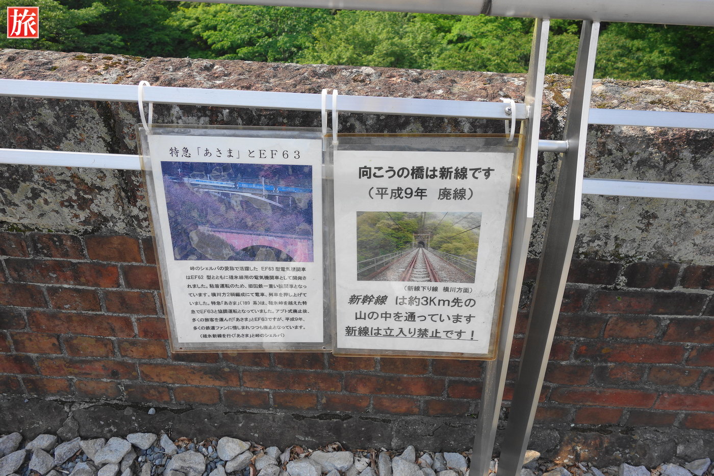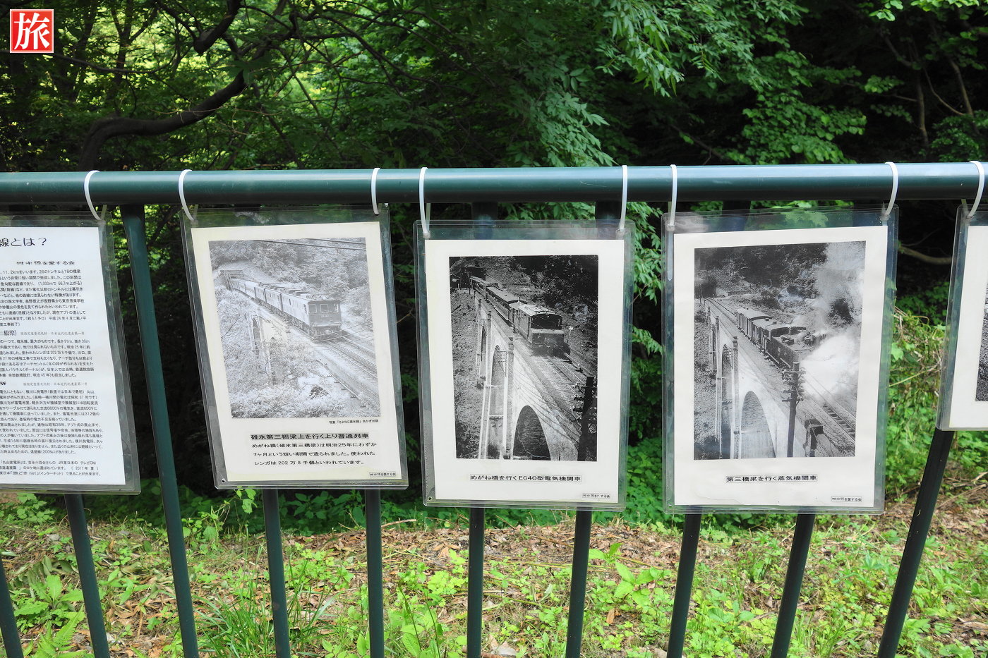 左(横川駅)方向が「めがね橋」の上です。写真資料が展示されています。橋上からはレンガ造り巨大な橋の感じは伝わってきませんでした。