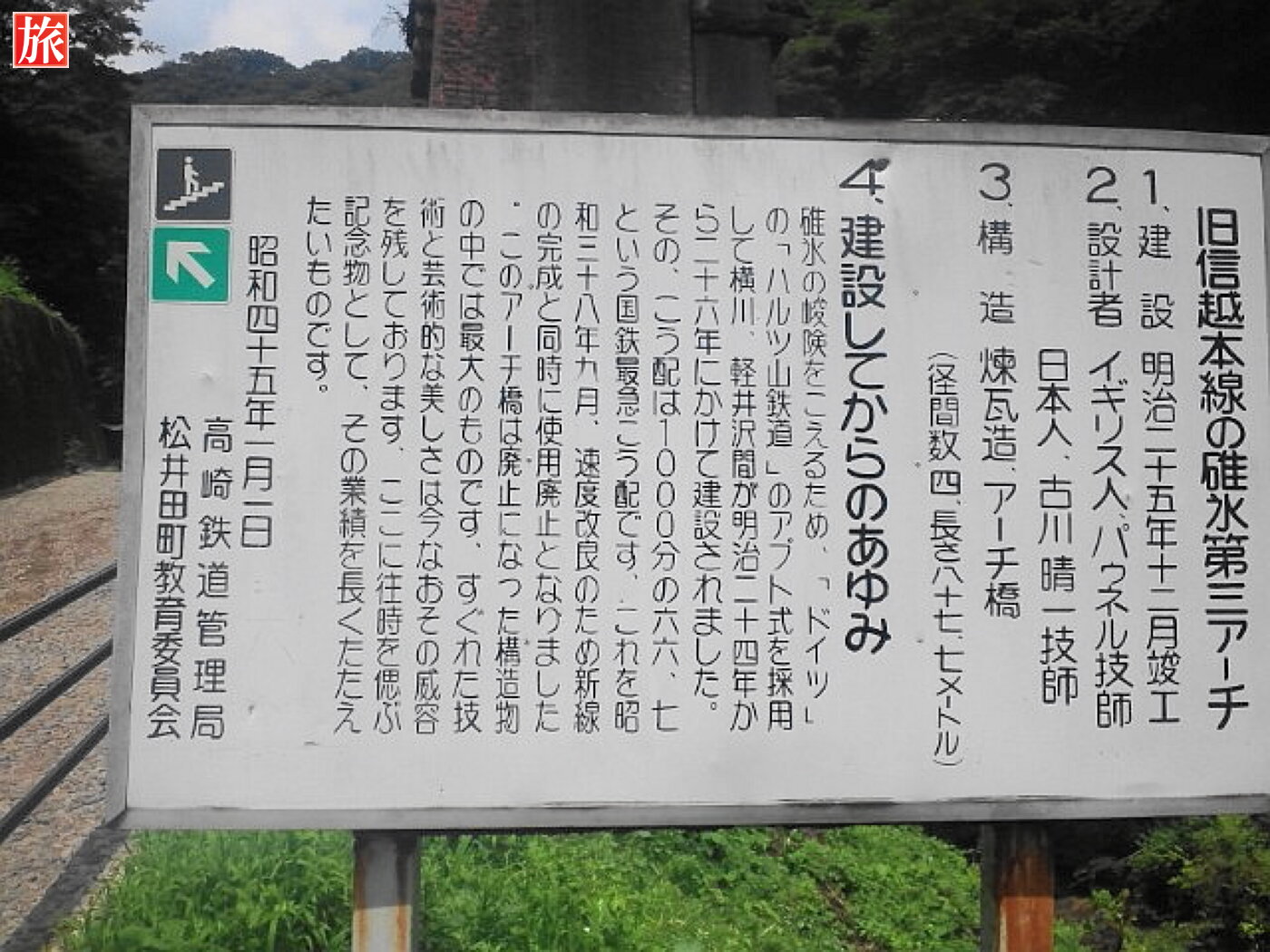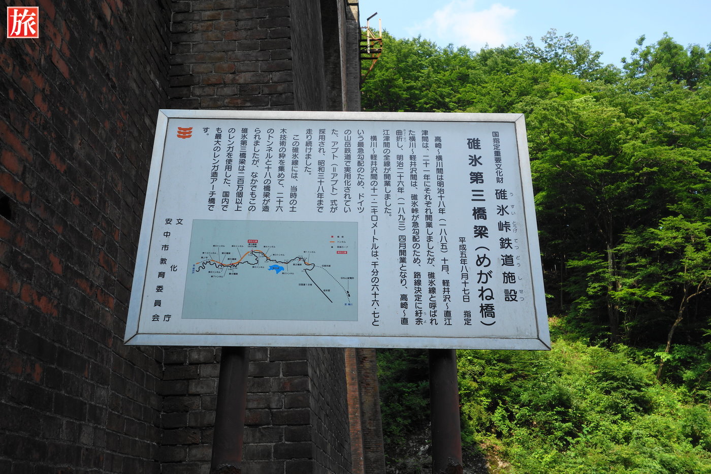 旧信越本線の碓氷第三アーチ説明板。碓氷第三橋梁を見上げる。碓氷第三橋梁上は遊歩道「アプトの道」となっています。