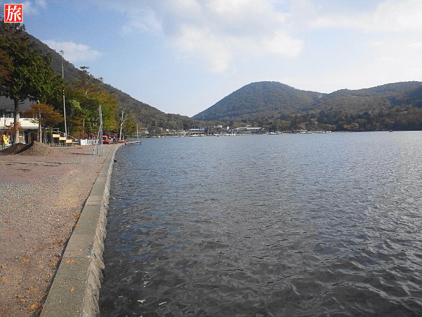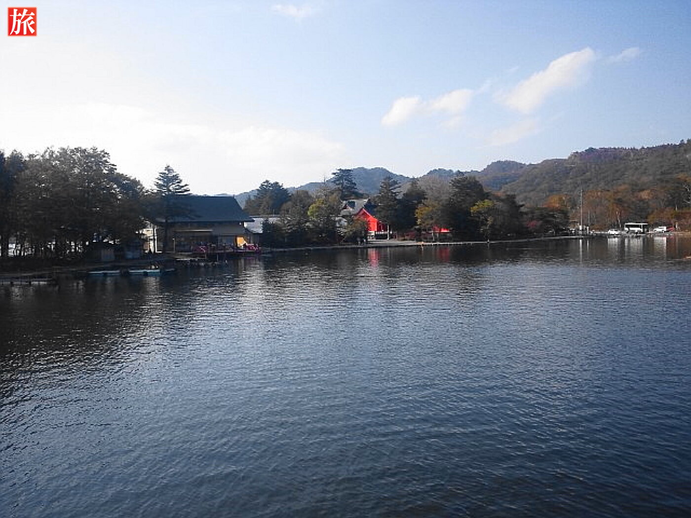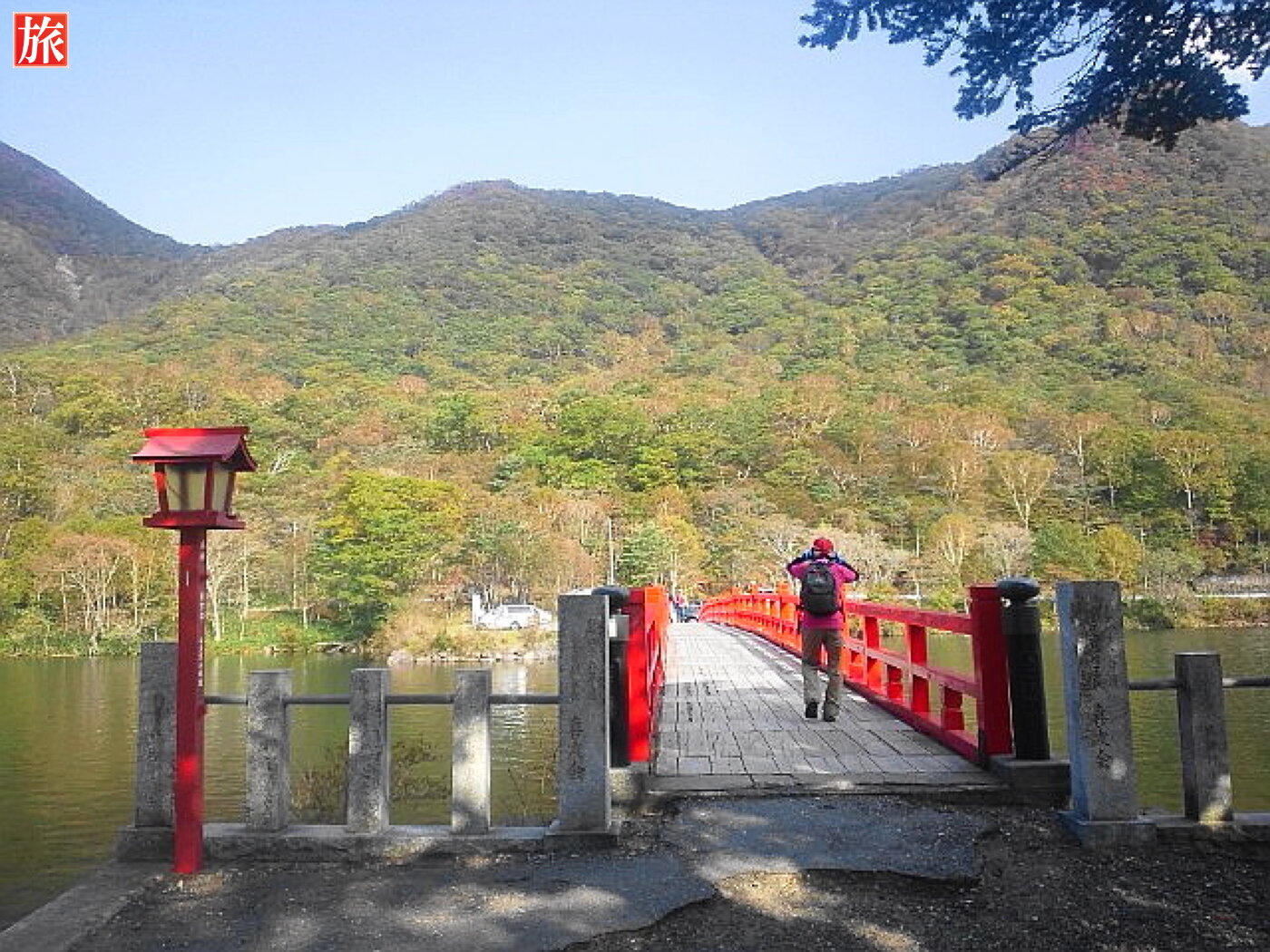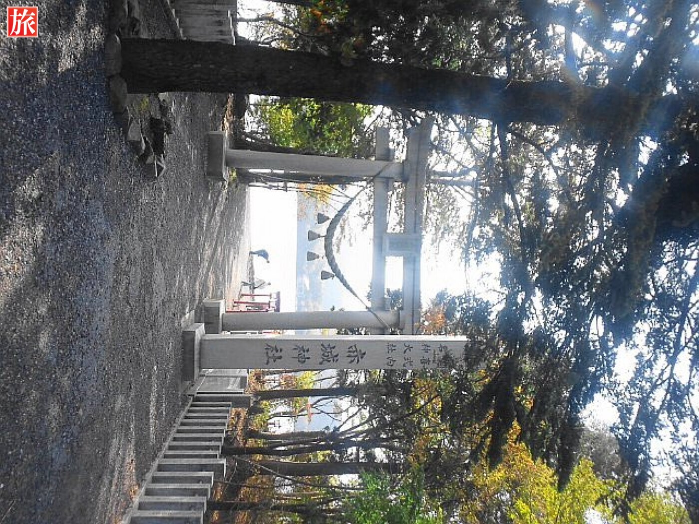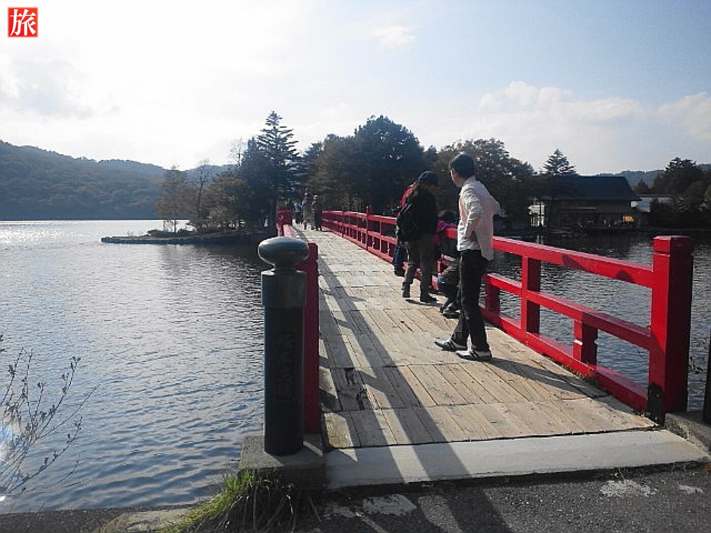 振り返って見た様子。啄木鳥橋を渡りきりました。正面に石造鳥居があります。鳥居を潜ると、湖畔を見渡すように参道が続いています。
