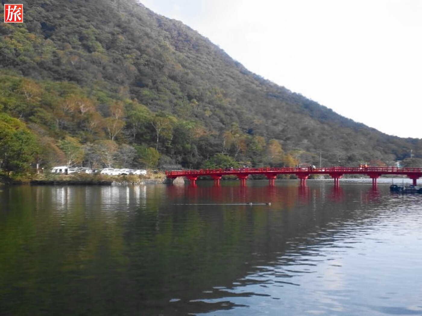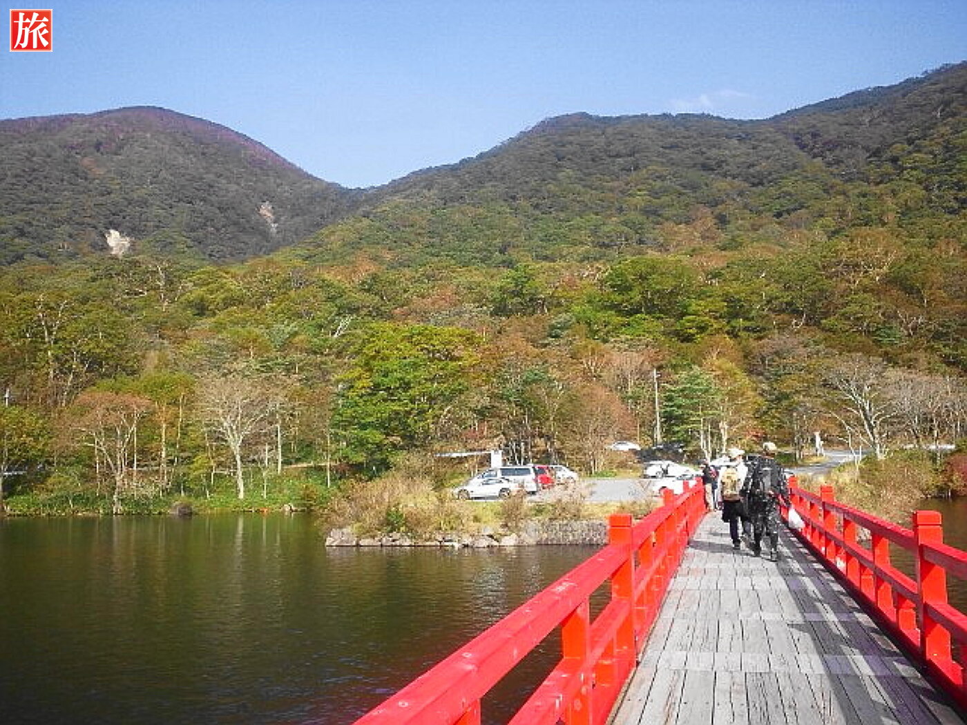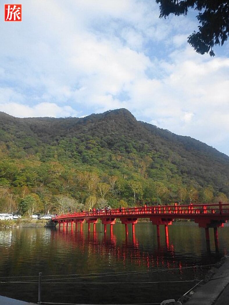 朱塗りの神橋を渡り鳥居をくぐると大沼を見渡す景色が広がる。境内からは外輪山の山々が一望できる。