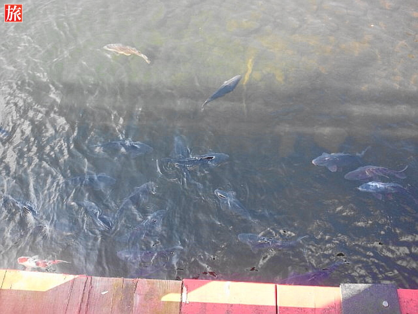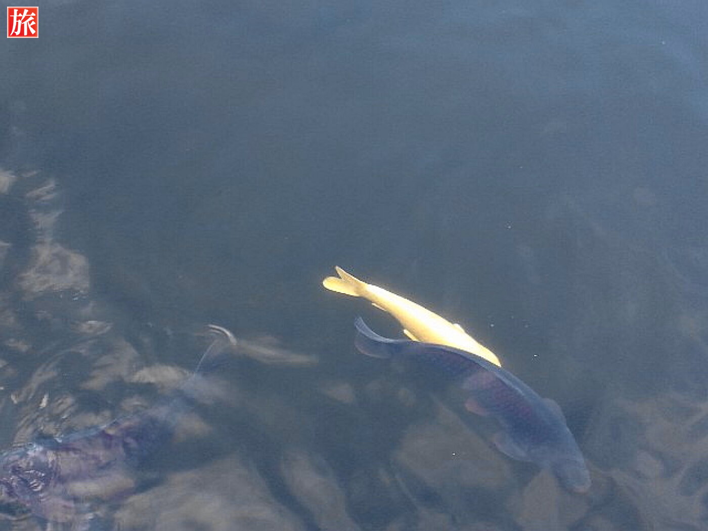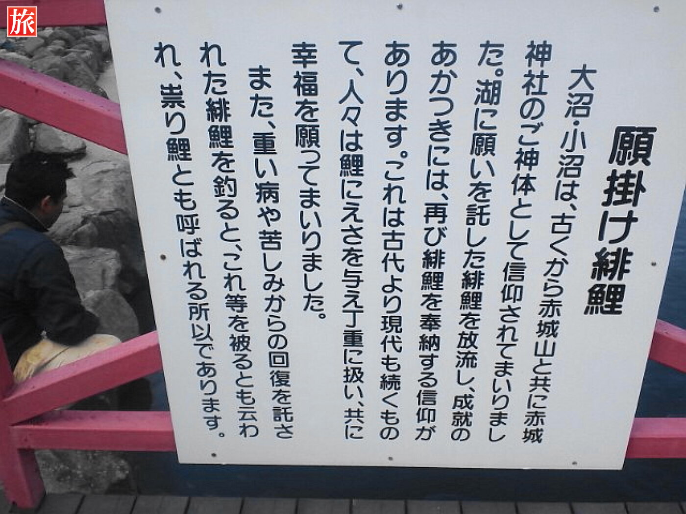 願掛け緋鯉。願掛け緋鯉の説明板。赤城山を望む。
