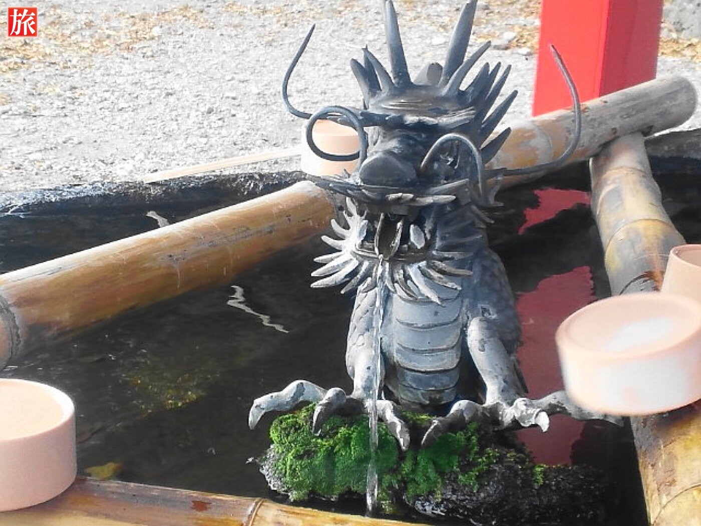拝殿に向かって左側にある手水舎。朱塗りが鮮やかな三間社、切妻造の本殿。