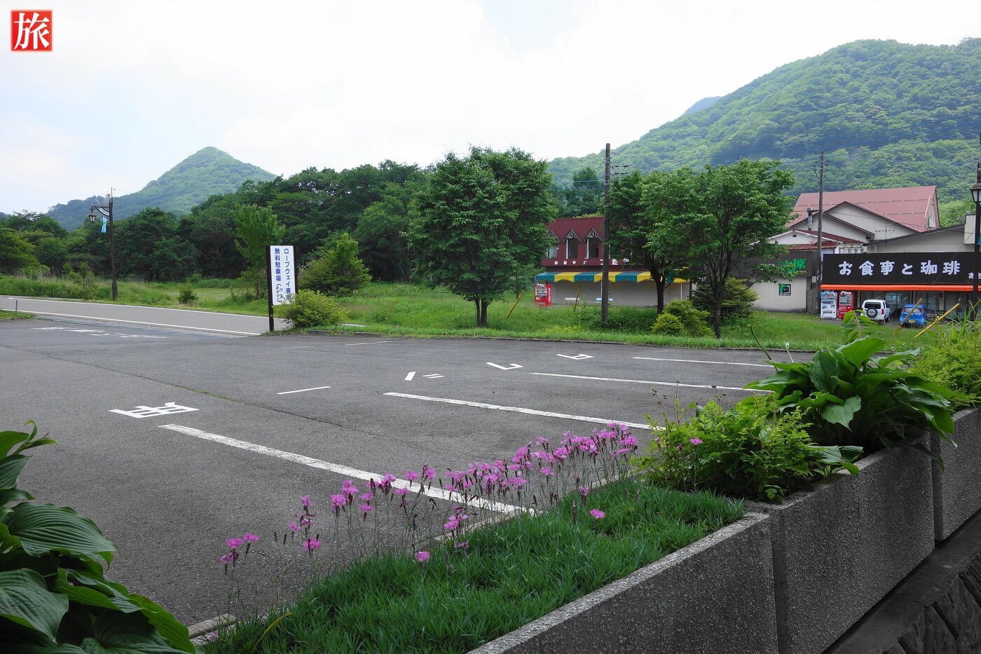 ロープウェイ前にバス停があります。榛名湖畔寄りの駐車場。道路を挟んで向かいにお土産屋さんがあります。榛名富士山頂方向を眺める。