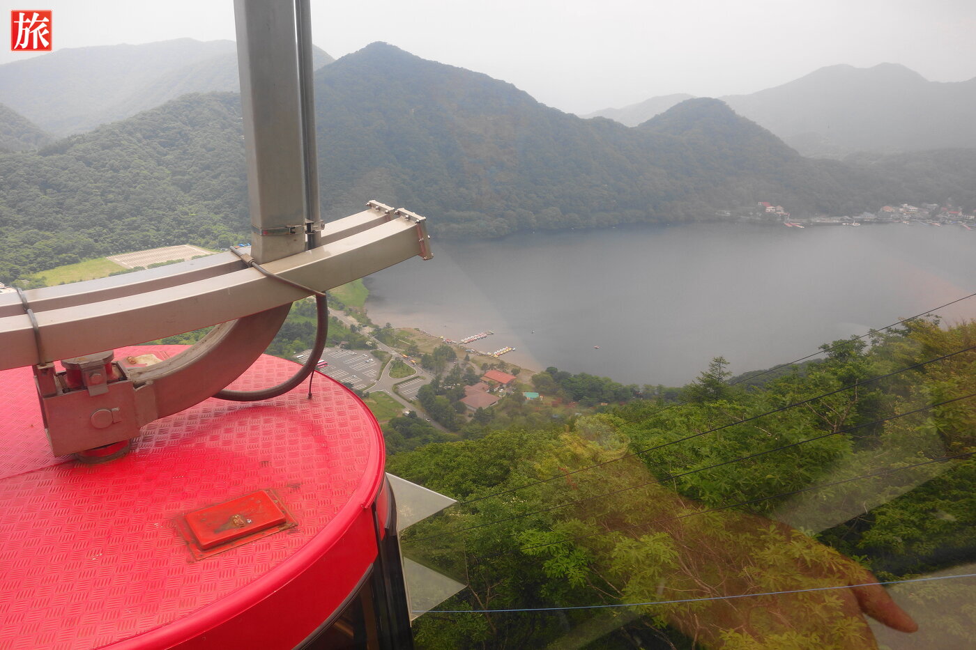 1号のゴンドラに乗り東方向を眺めた風景。下りのゴンドラとすれ違います。西方向には榛名湖が見えてきました。ゴンドラ内に迷い込んだ蝶!