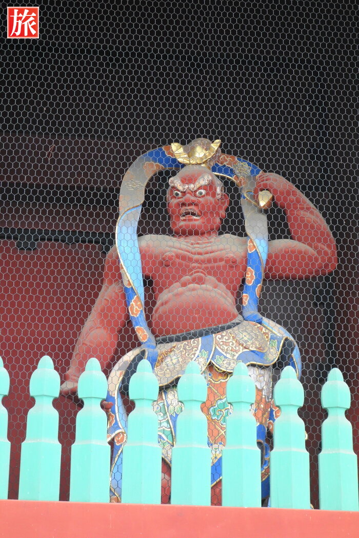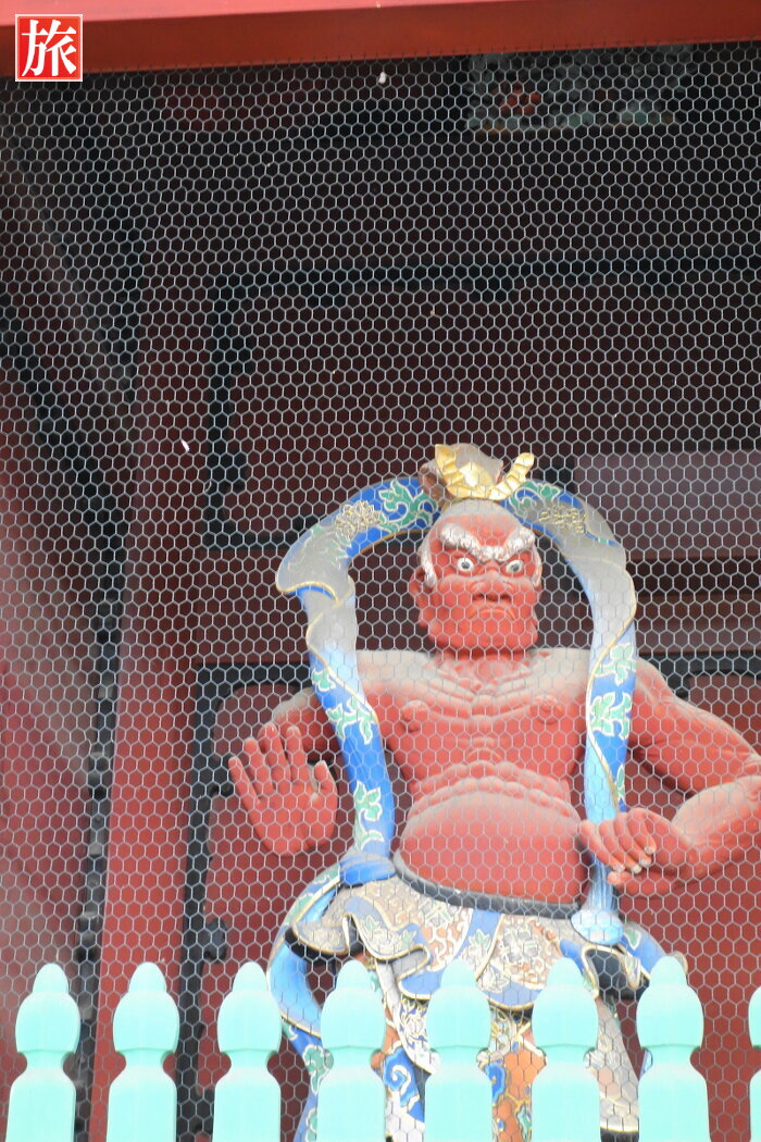 関東一の壮大さを誇る、鮮やかな朱色の総門(旧白雲山石塔寺の仁王門)。高さ12メートル。切妻造りの八脚門。仁王像が門を護っています。門の右側の像と左側の像。
