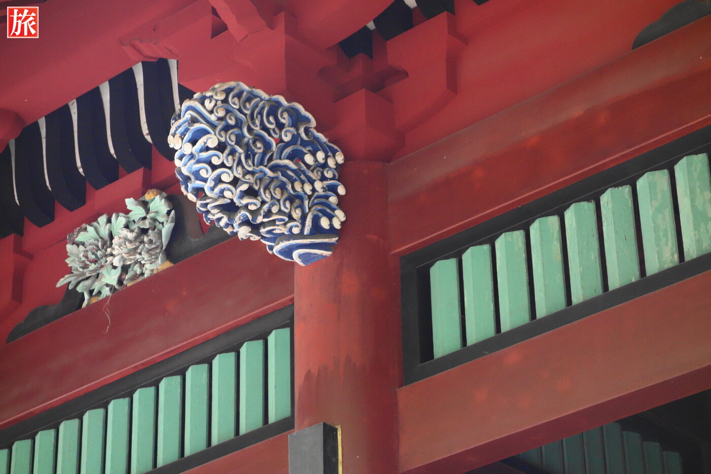 随神門の上部には唐門があります。宝暦六年(1756)の建造の唐門から見た風景。唐門には全国有数の趣向を凝らした装飾がしてあります。天井には龍が。松に鳳風の透彫。