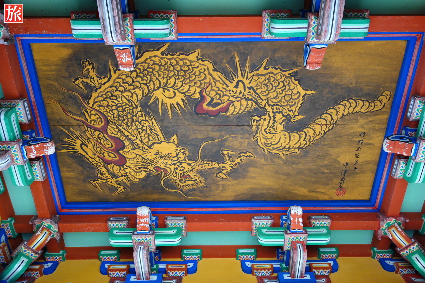 拝殿、幣殿、本殿からなる御本社(宝暦六年・重文)。扁額は金色の額でした。拝殿の龍は上り龍と下り龍が対をなしています。