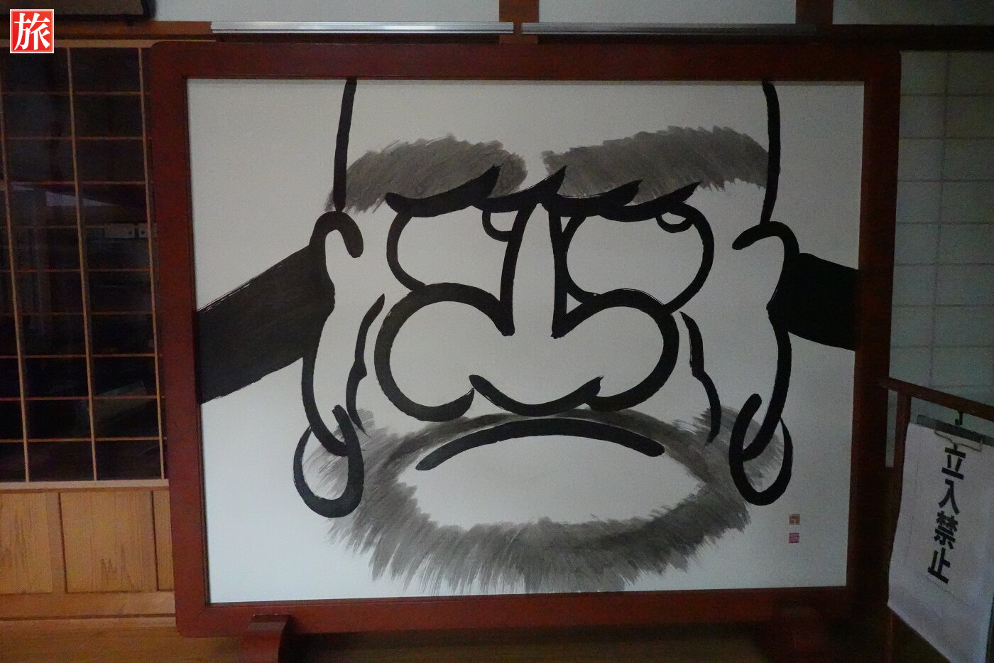 本堂拝観受付入口へ。入口正面に住職が手描きで描いたという禅の始祖である達磨大使の絵。