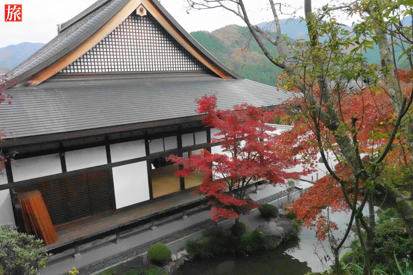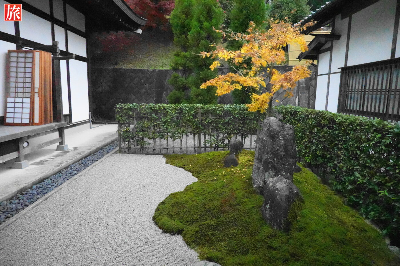 山々を借景とした美しい枯山水庭園。春には牡丹、秋には紅葉が楽しめる。