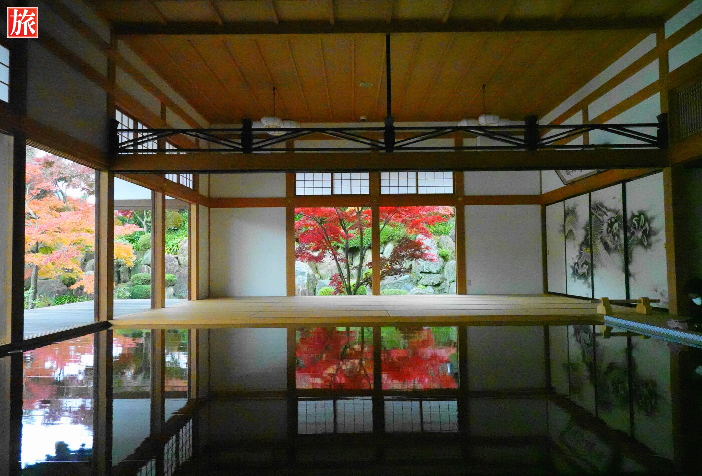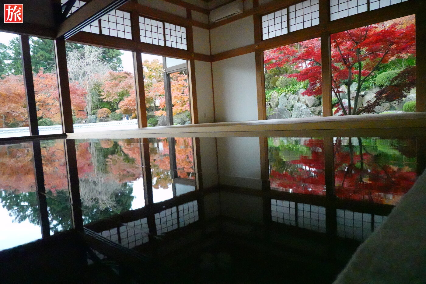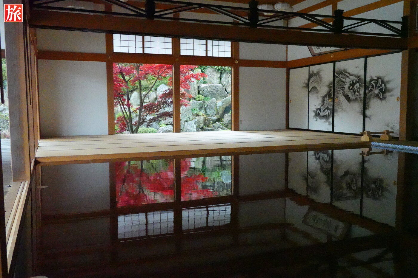 庭園からの風景。本堂裏手方向に小さな滝が・・、この滝も床に映りこんでいました。