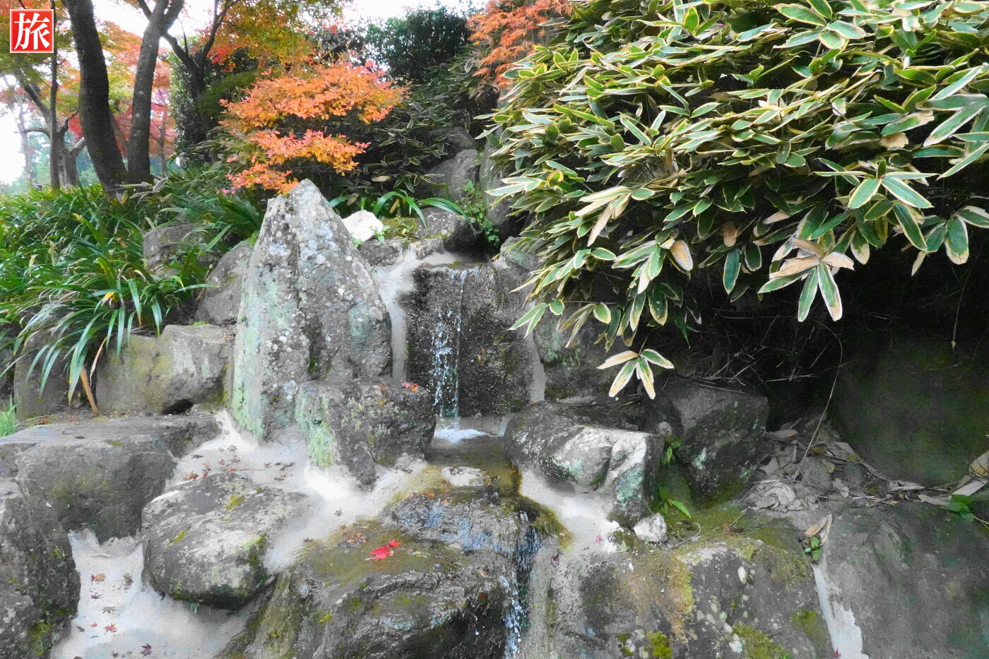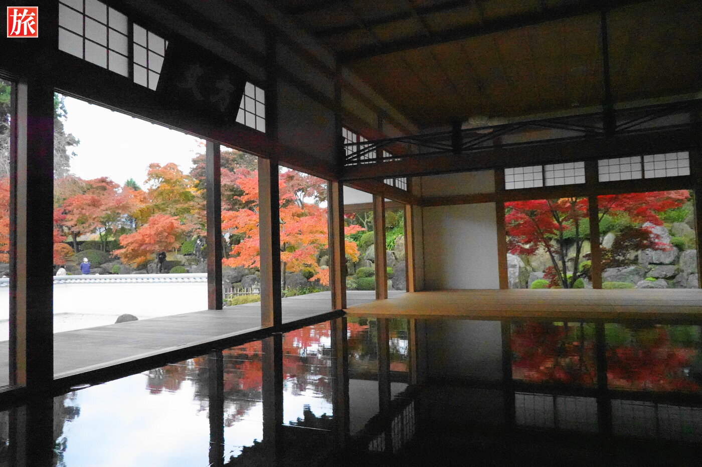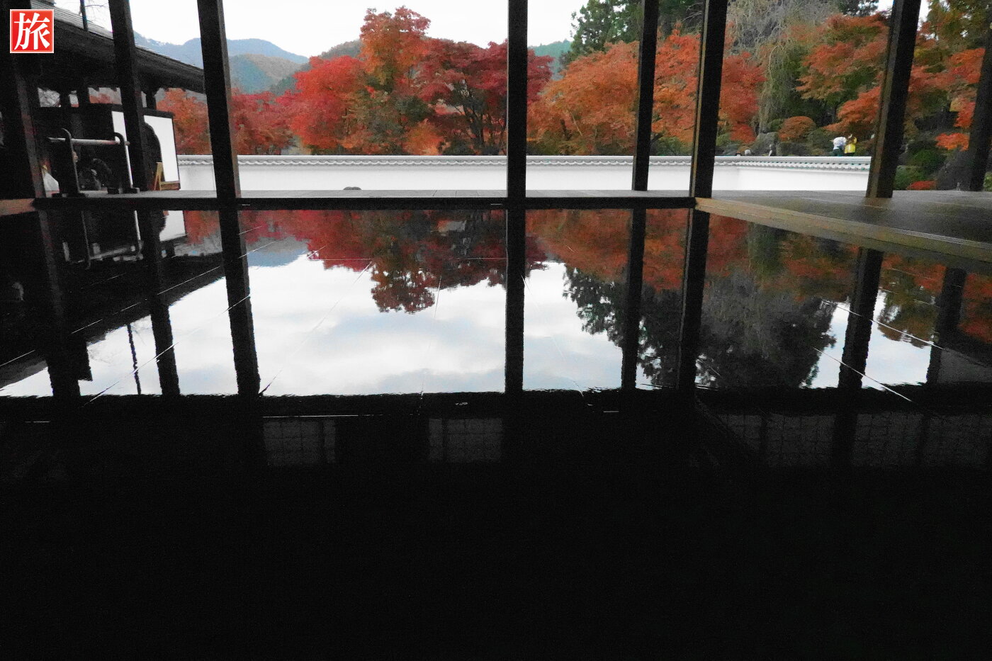 庭園からの風景。本堂裏手方向に小さな滝が・・、この滝も床に映りこんでいました。