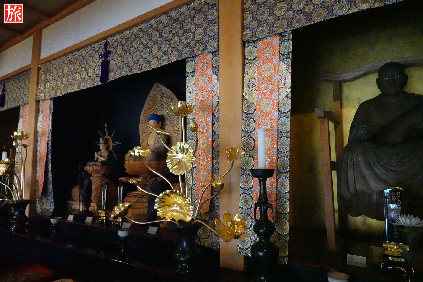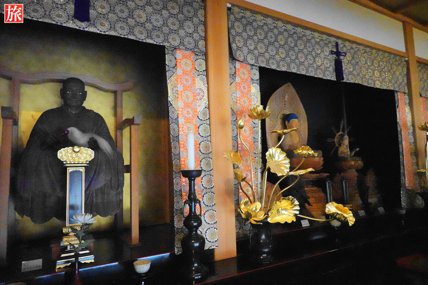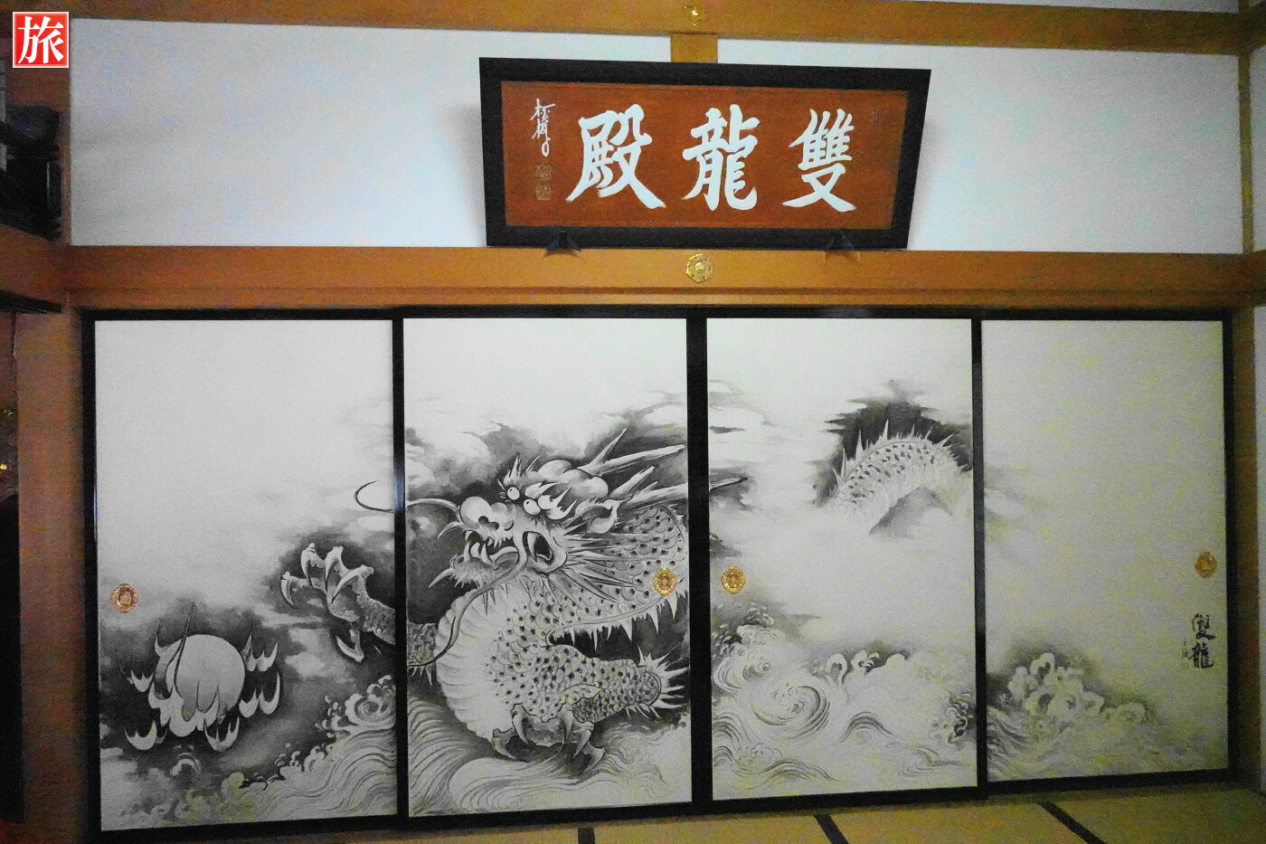 3体の菩薩。水墨画で描かれた見事な双龍(右側) 作者は、宝徳寺の本山である「鎌倉建長寺」の襖絵(非公開)を描いた白浪画伯。