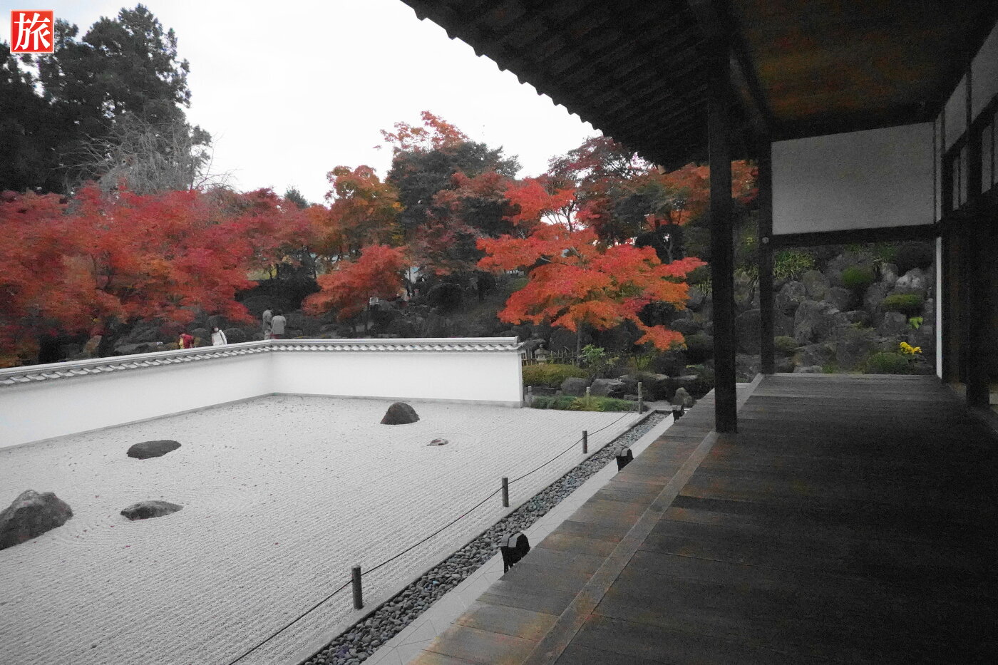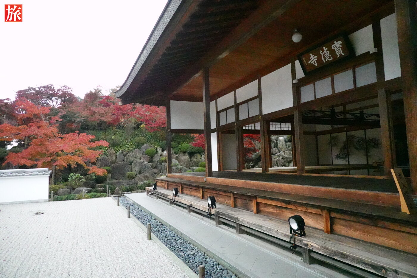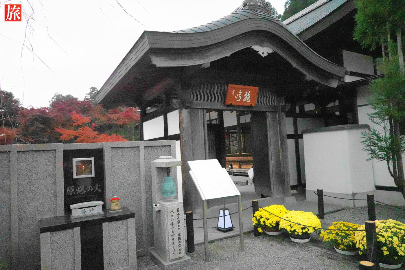 本堂出口付近から風景。本堂の正面に広がる枯山水庭園。広島原爆の残り火から分火された「原爆の火」が灯っています。