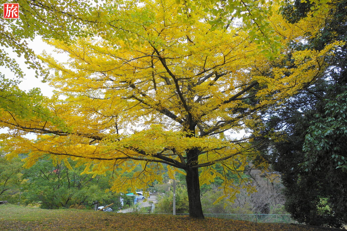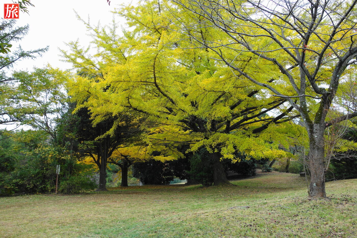 ここのイチョウは雄、雌(果実:銀杏のなる木)が仲良く並び、この時期は美しく黄葉します。イチョウは取水塔側(貯水池の東)の駐車場近くにあります。訪れる人も少なくB級スポット認定です。まだ少し見頃には早いようですが、緑がかった黄色もいい味を出していました。