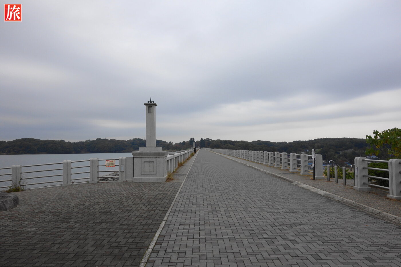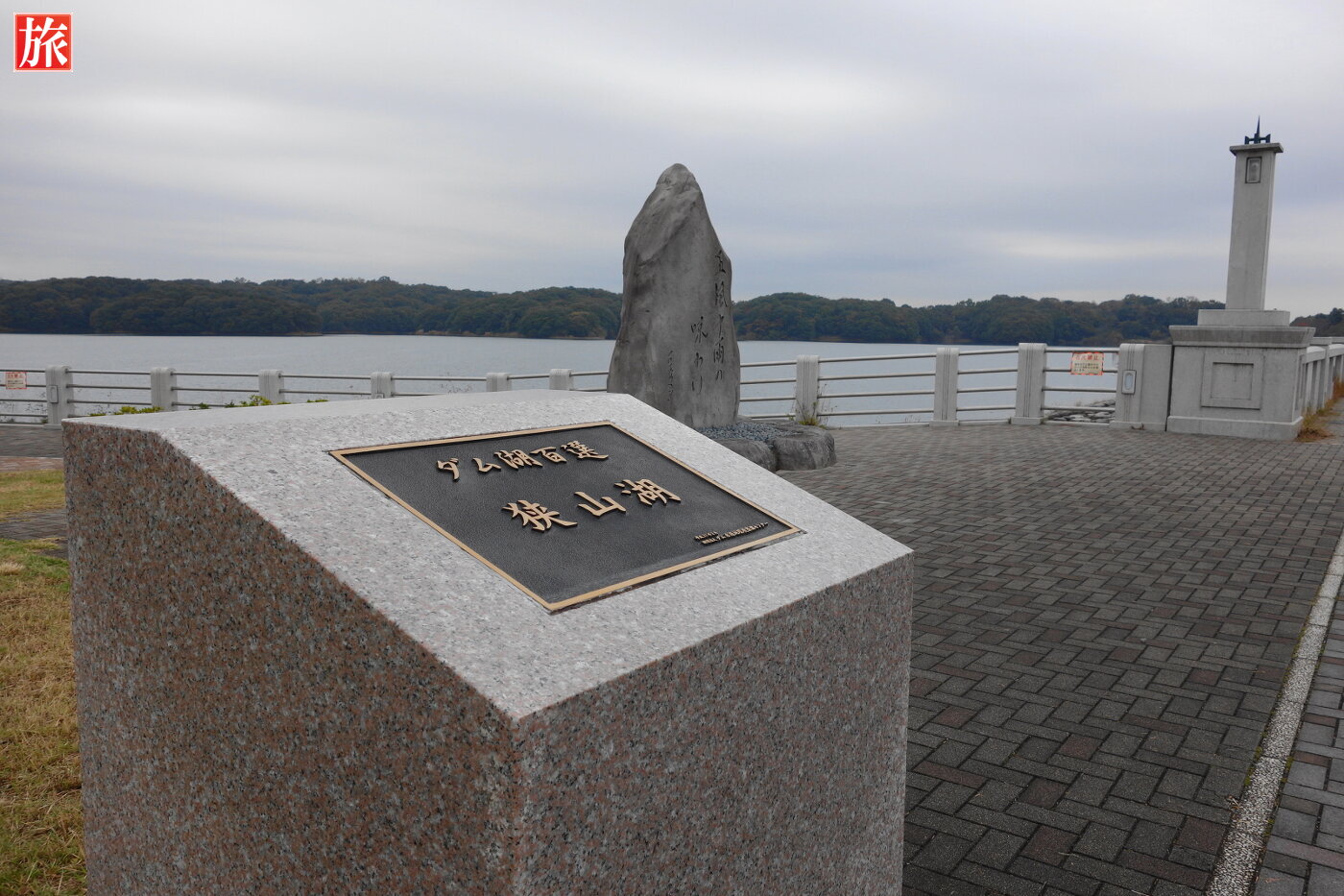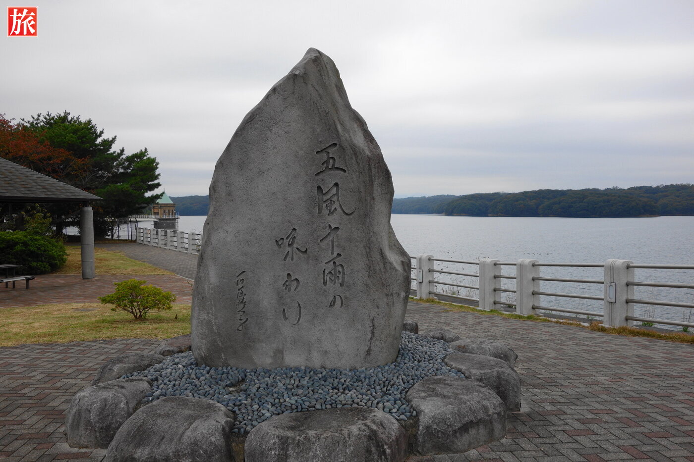 山口貯水池(狭山湖)を望む。あいにくの天気でしたが、晴れている日は富士山が良く見えます。記念碑「五風十雨の味わい」。石原慎太郎・東京都知事による書で阪神淡路大震災を教訓に、耐震強化工事が1998年から2002年に行われたこと記念し建てた碑です。