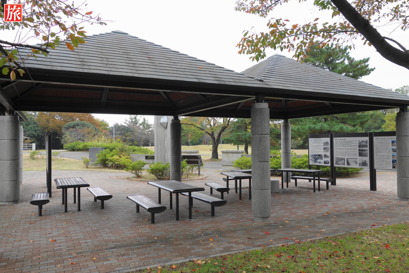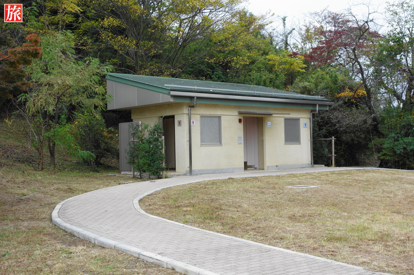 取水塔。屋根付きのベンチ近くに広がる芝生。公衆トイレ。