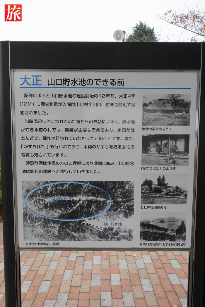 山口貯水池の案内板。左から、大正:山口貯水池ができる前。昭和:山口貯水池の誕生。平成:生まれ変わった山口貯水池。
