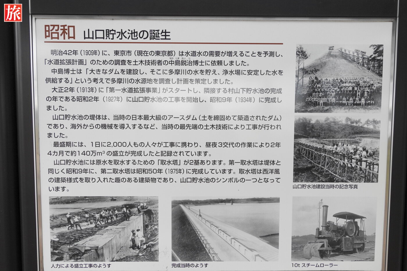 山口貯水池施設案内の看板。堰堤の様子です。ダム湖100選・狭山湖の石像。