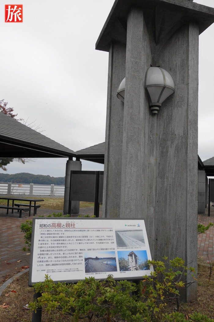 山口貯水池建設時の高欄と親柱。第二次世界大戦中に爆撃から堤体を守るために耐弾層が施工され、平成の堤体強化工事でその耐弾層を撤去しました。耐弾層の下に埋もれていた高欄は約55年ぶりに姿を見せ、その一部が親柱とともに展示されています。