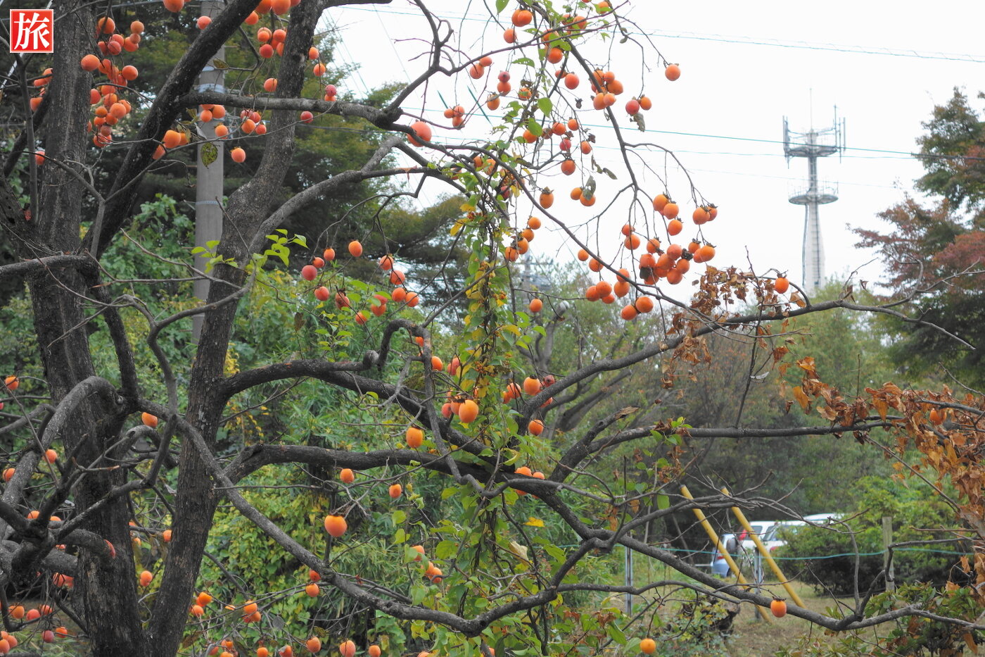 山口貯水池入口付近の様子です。道路沿いに柿の実がなっていました。雄のイチョウ(道路側)。