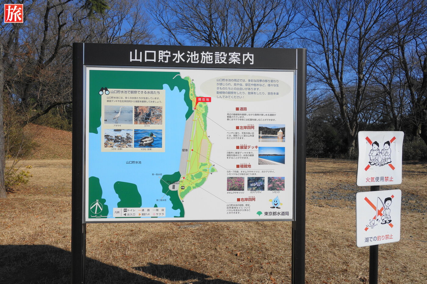 冬の山口貯水池(2014年1月):山口貯水池北側にある施設案内の看板。オオタカが生息しているらしく、シャッターチャンスを狙っている愛好家が沢山いました。山口貯水池を望む。