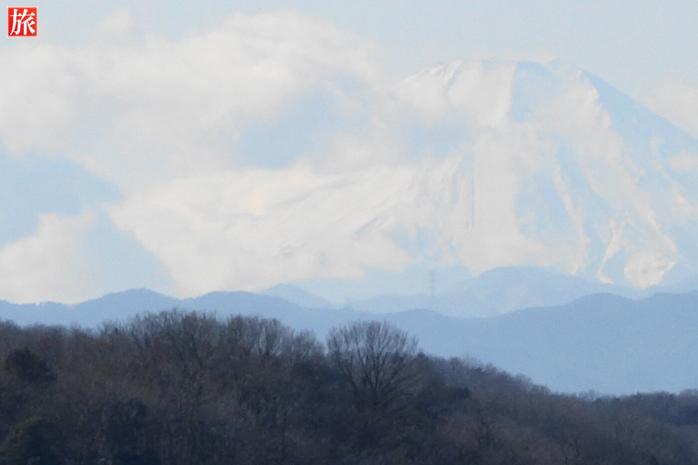 屋根の尖った取水塔方向を望む。霞の向こうに富士山が見えます。富士山をズームしてみました。