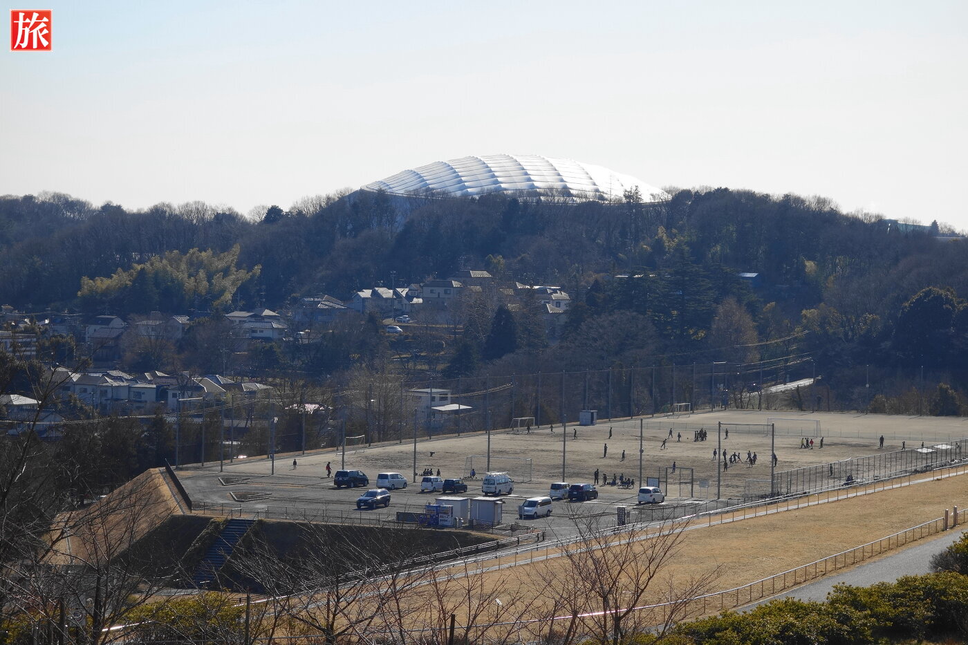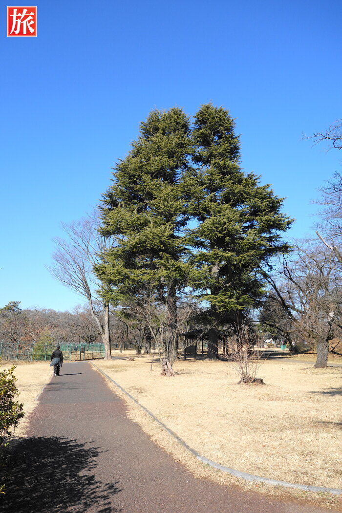 東南方向に西武ドーム。堰堤の様子。向き合った2本の木。北側にある芝生の広場。春には桜が咲き綺麗です。