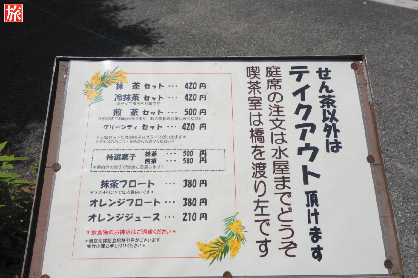 茶室「彩翔亭」。回遊式の庭園。メニュー。橋を渡り茶室へ。