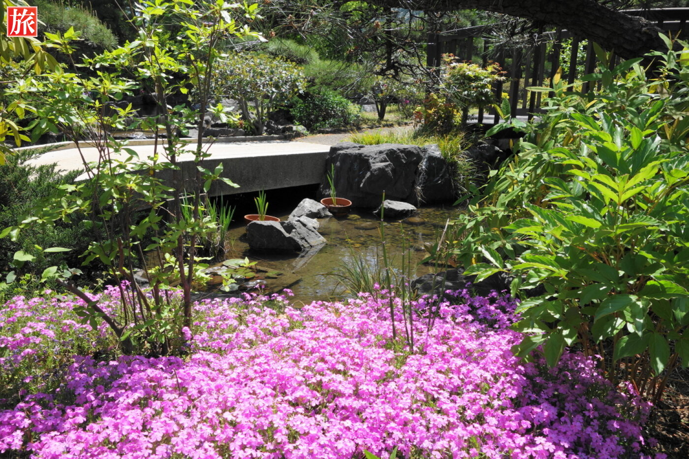 少年航空兵像(彫刻家・長沼孝三作)。シバザクラの花園(花の丘)。放送塔方向から中央の園路、南側を見た様子。放送塔。