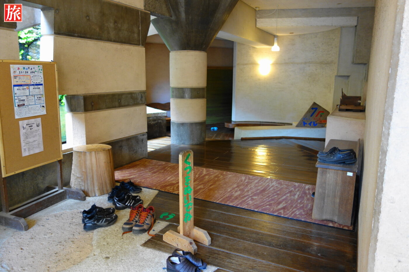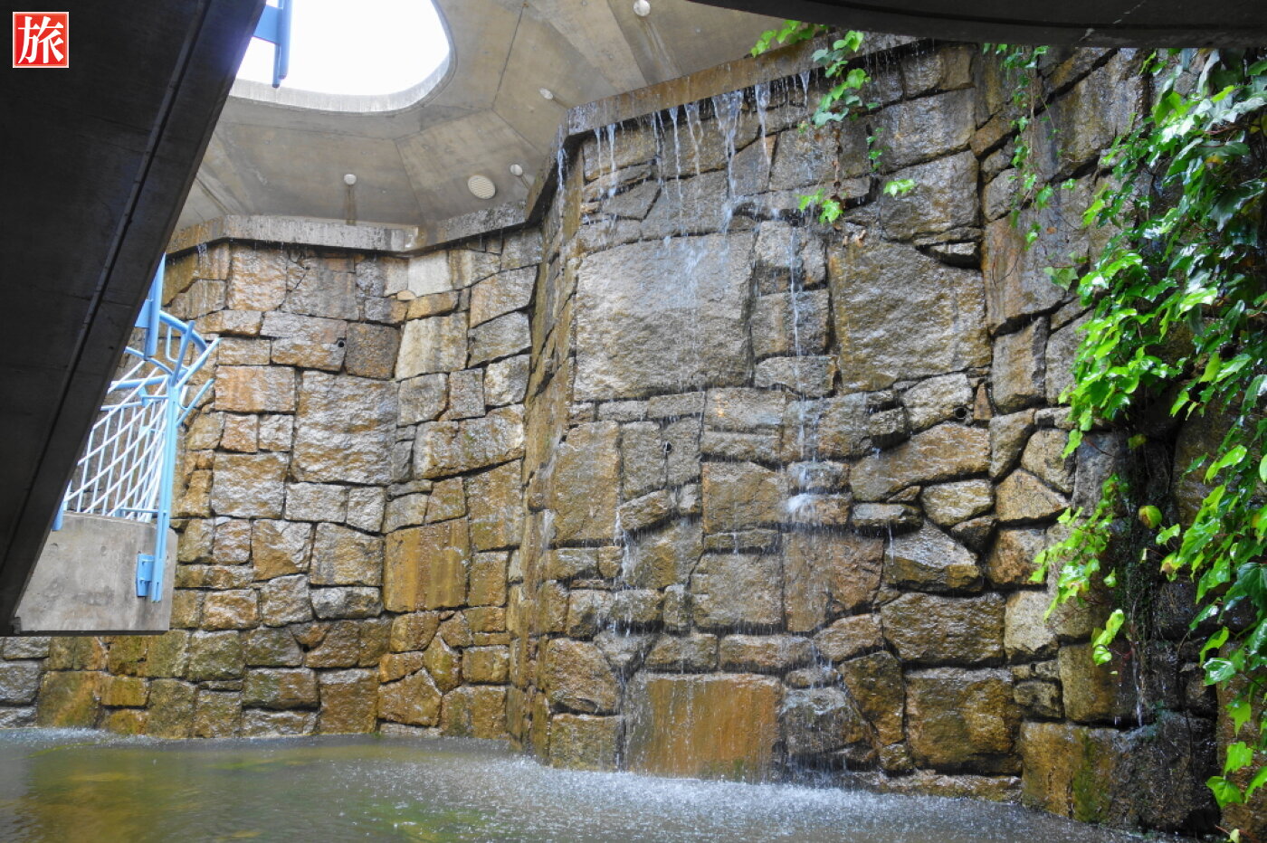 子ども劇場の正面です。1階は管理事務所、2階には子ども劇場があります。内部の様子です。子ども劇場内部から壁面に流れる滝をみる。
