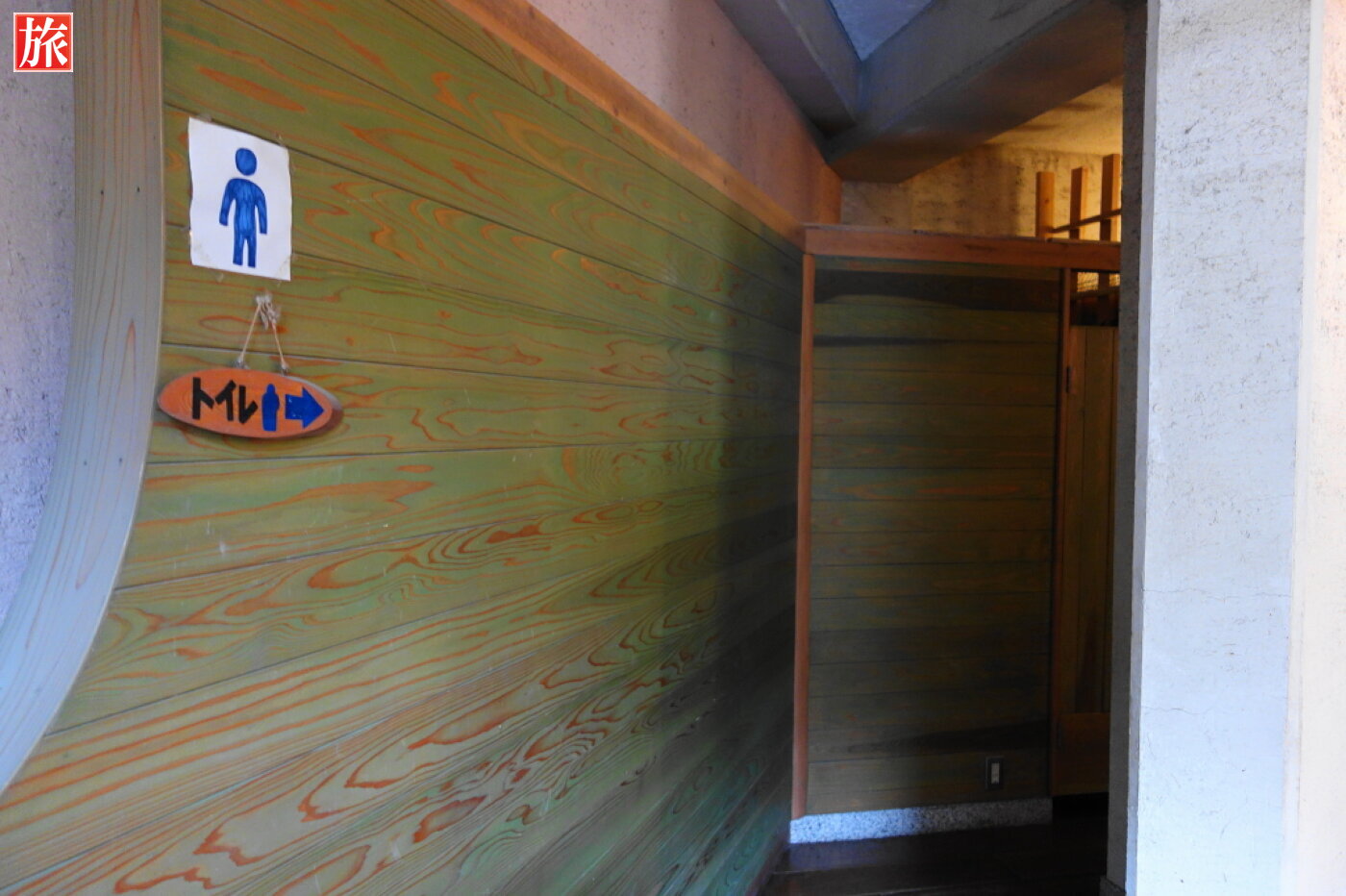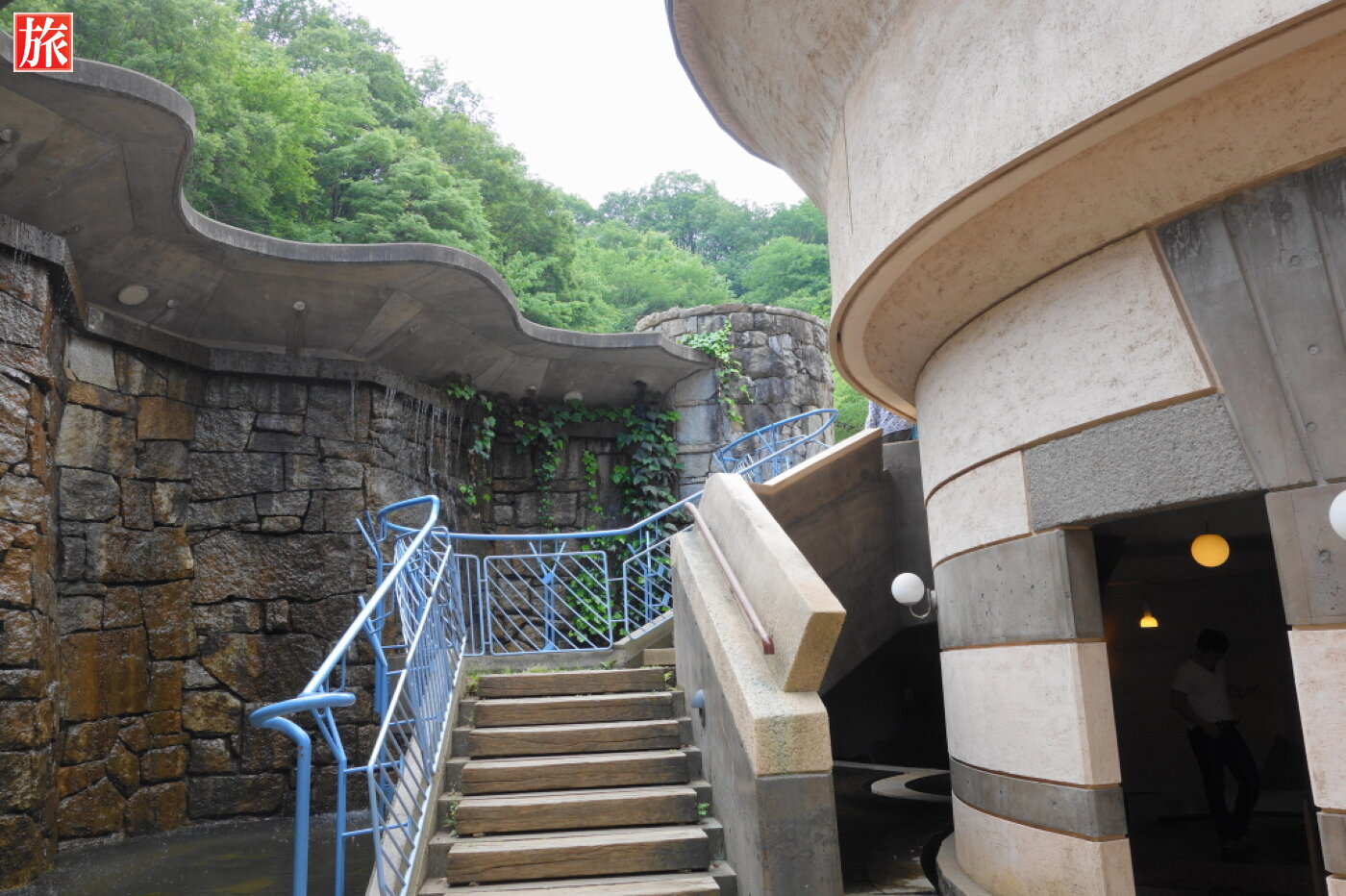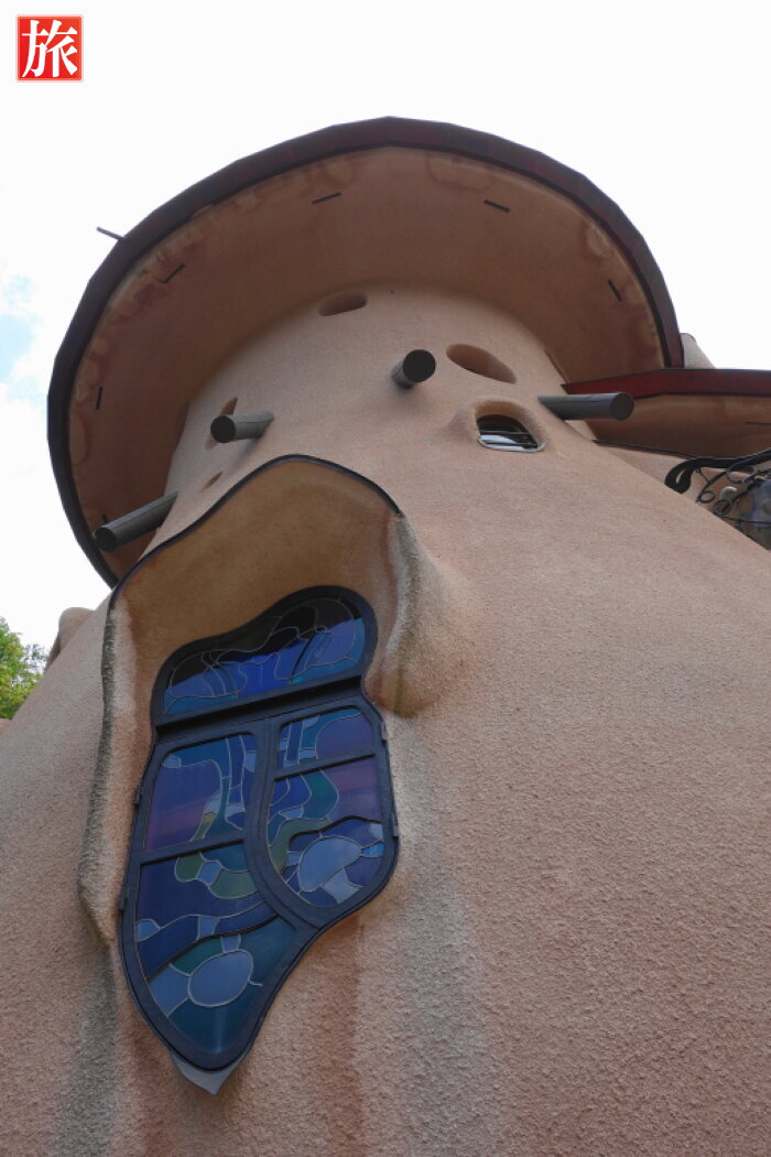 1Fにあるトイレです。曲線の建物と階段です。 黒い大きな帽子をかぶったようなメルヘンチックな建物です。