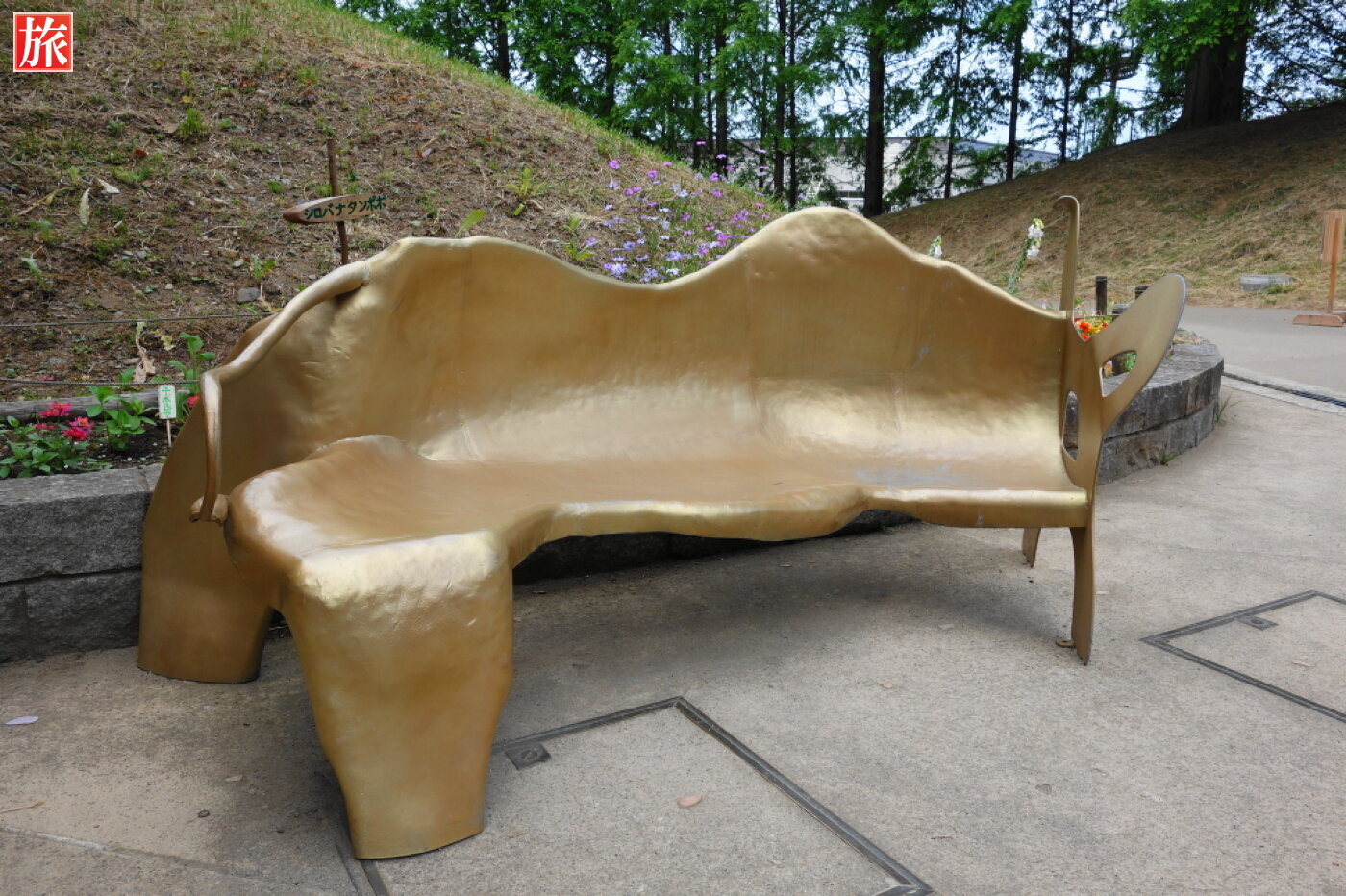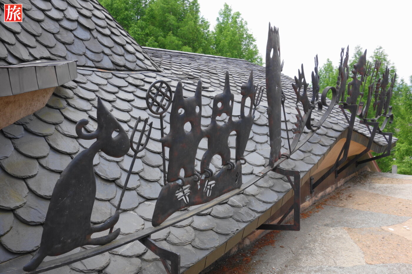 屋根には妖精たちが並びます。入口にある黄金色をしたベンチ。子ども劇場からムーミン屋敷を眺めた様子です。ムーミンが住むお家(ムーミン屋敷)です。
