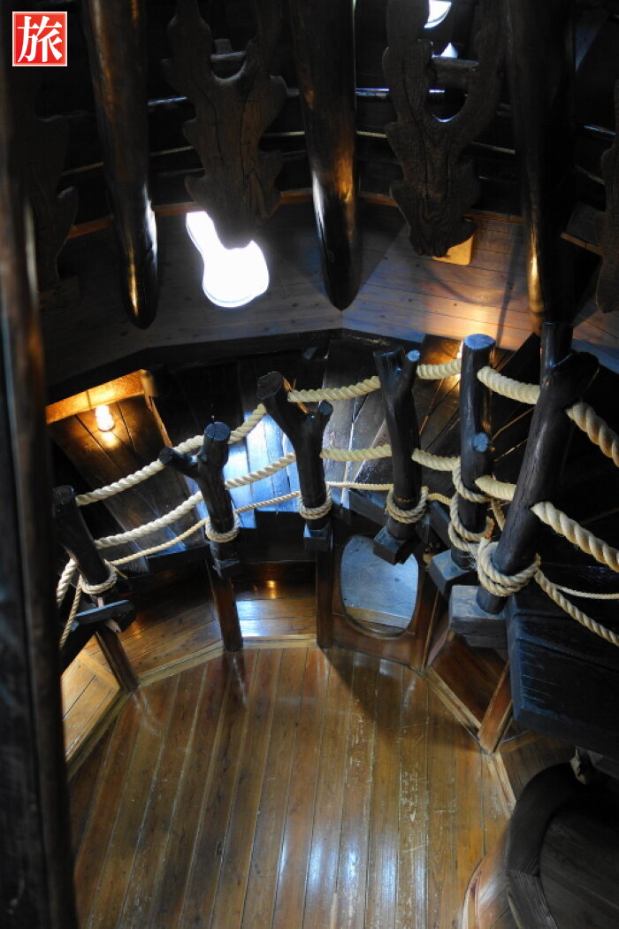 階段を下り地下1階の様子です。窓から見晴らし橋を見る。螺旋階段を上っていきます。