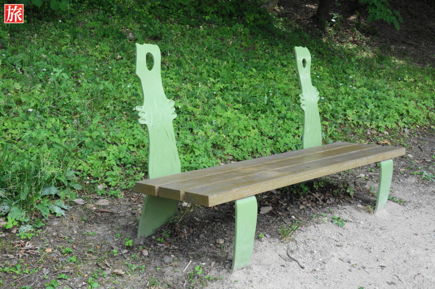 橋の窓からムーミン屋敷を眺めた様子です。可愛いベンチ。ムーミン屋敷と見晴らし橋のツーショット。