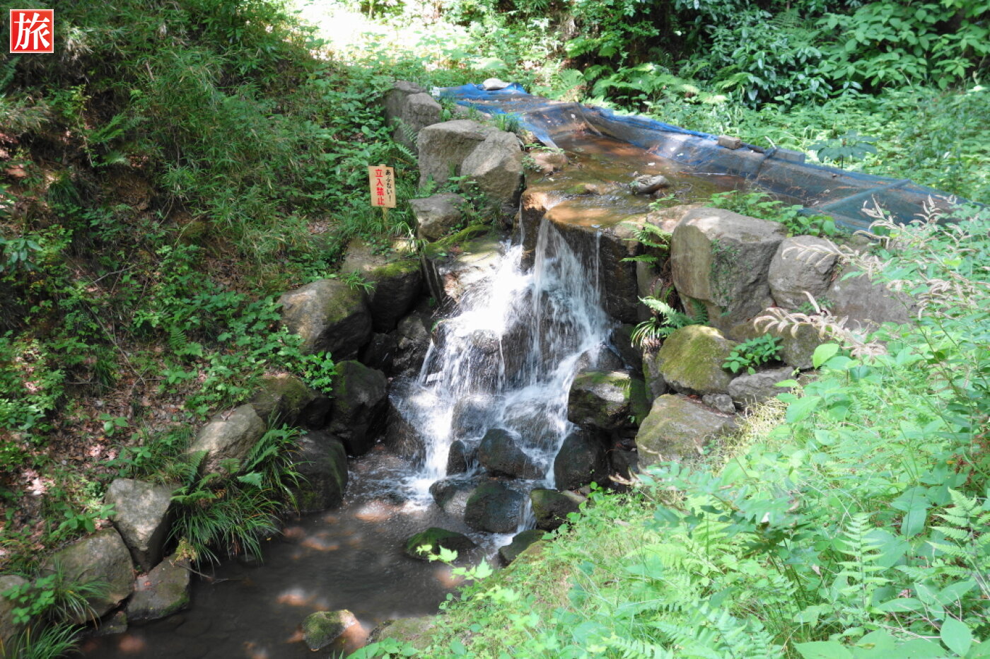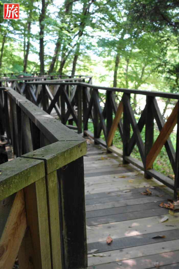 デッキウォーク終点付近の滝。デッキウォークの様子。