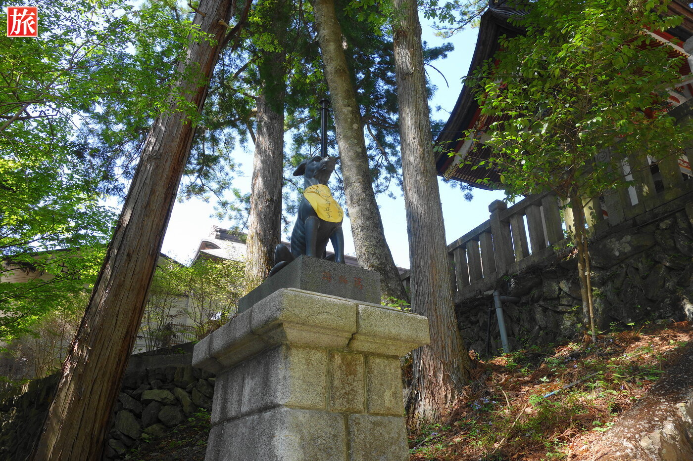 煌びやかな山門に掛かる扁額。山門の両脇にも口と耳を赤くした狼の狛犬。
