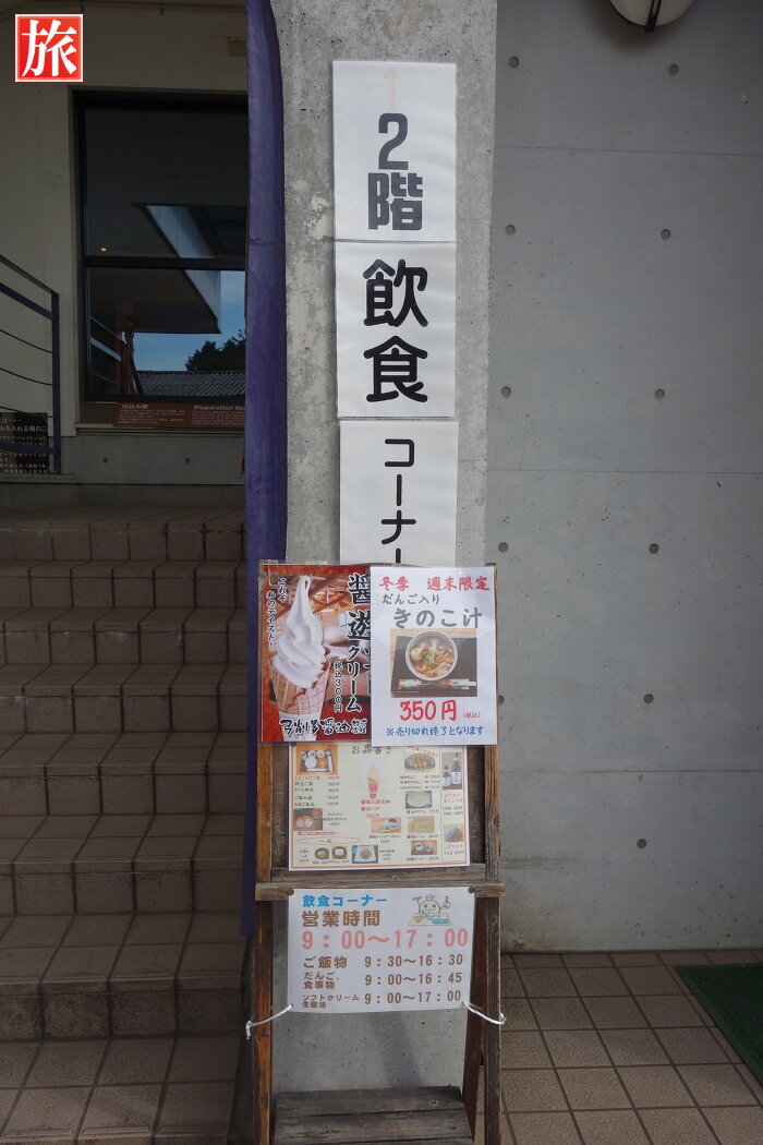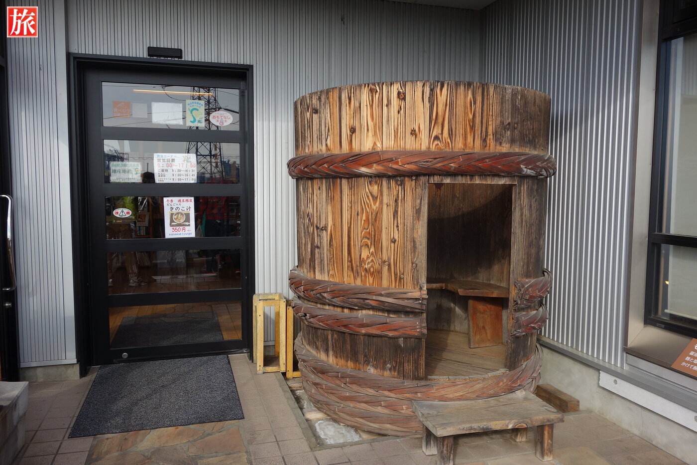 1階がお土産コーナーで2階で食事ができます。木桶の切り抜いた断面にある年輪に、木桶の秘密が隠されているそうです。