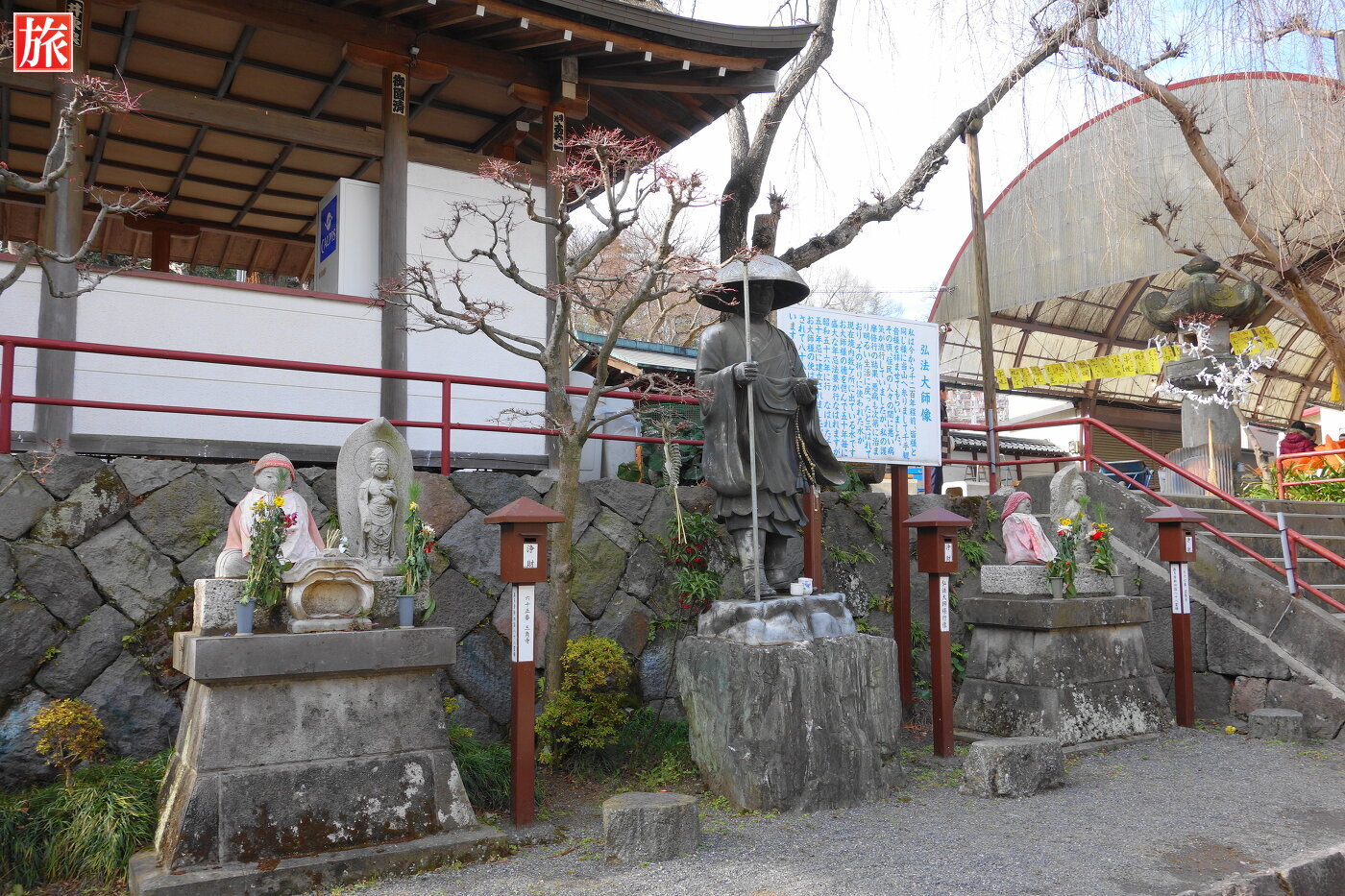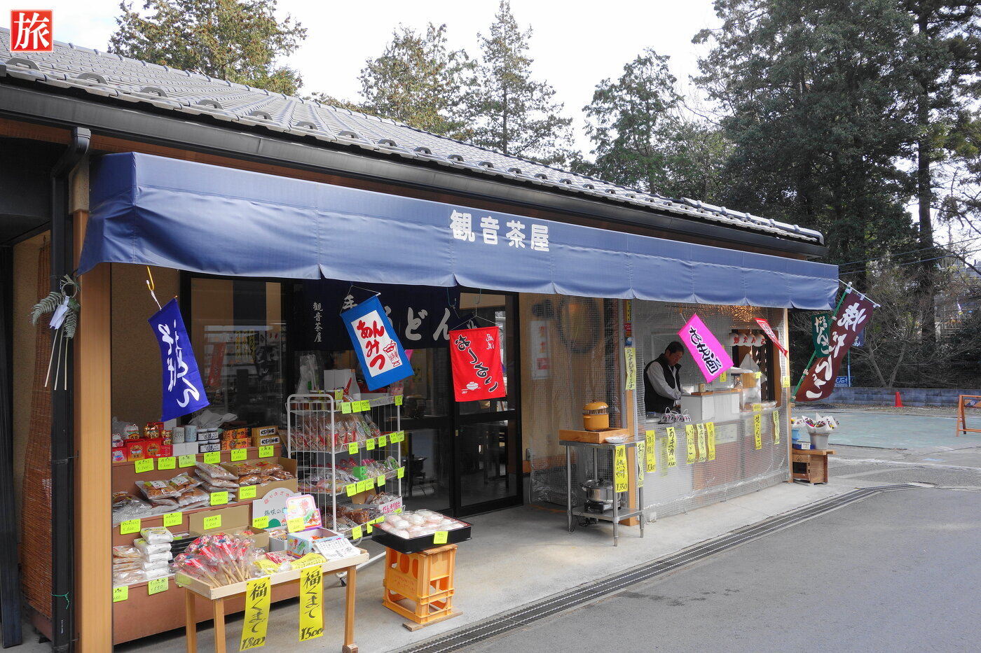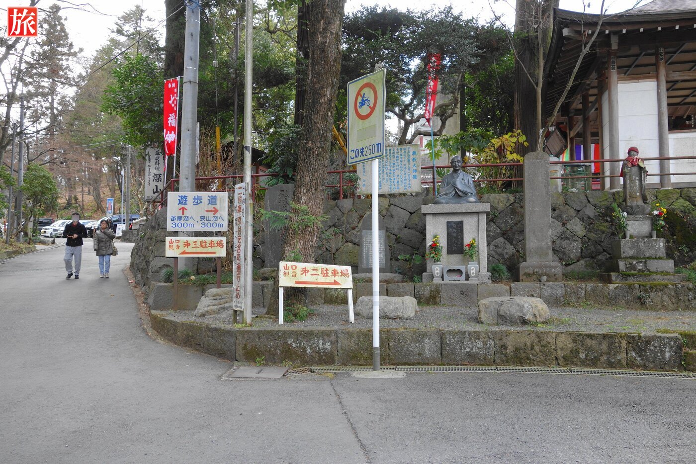山口観音駐車場付近の様子です。観音入り口右手には弘法大師像がありました。名物の焼き団子店。
