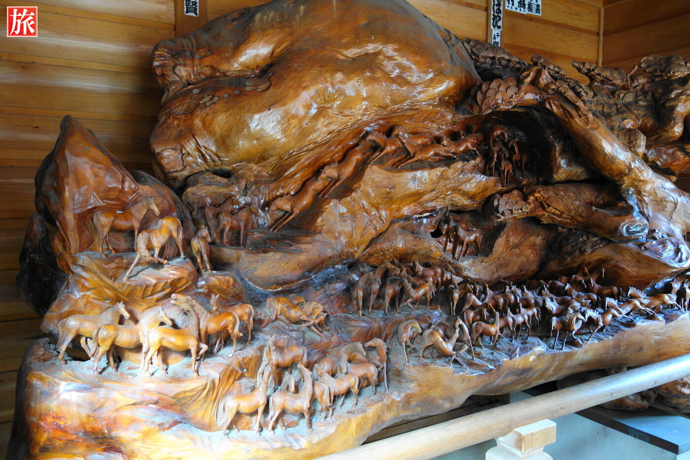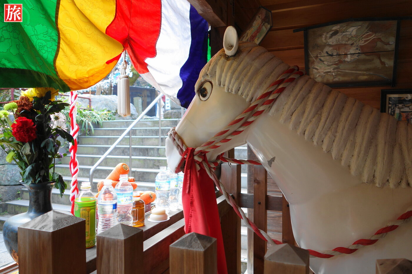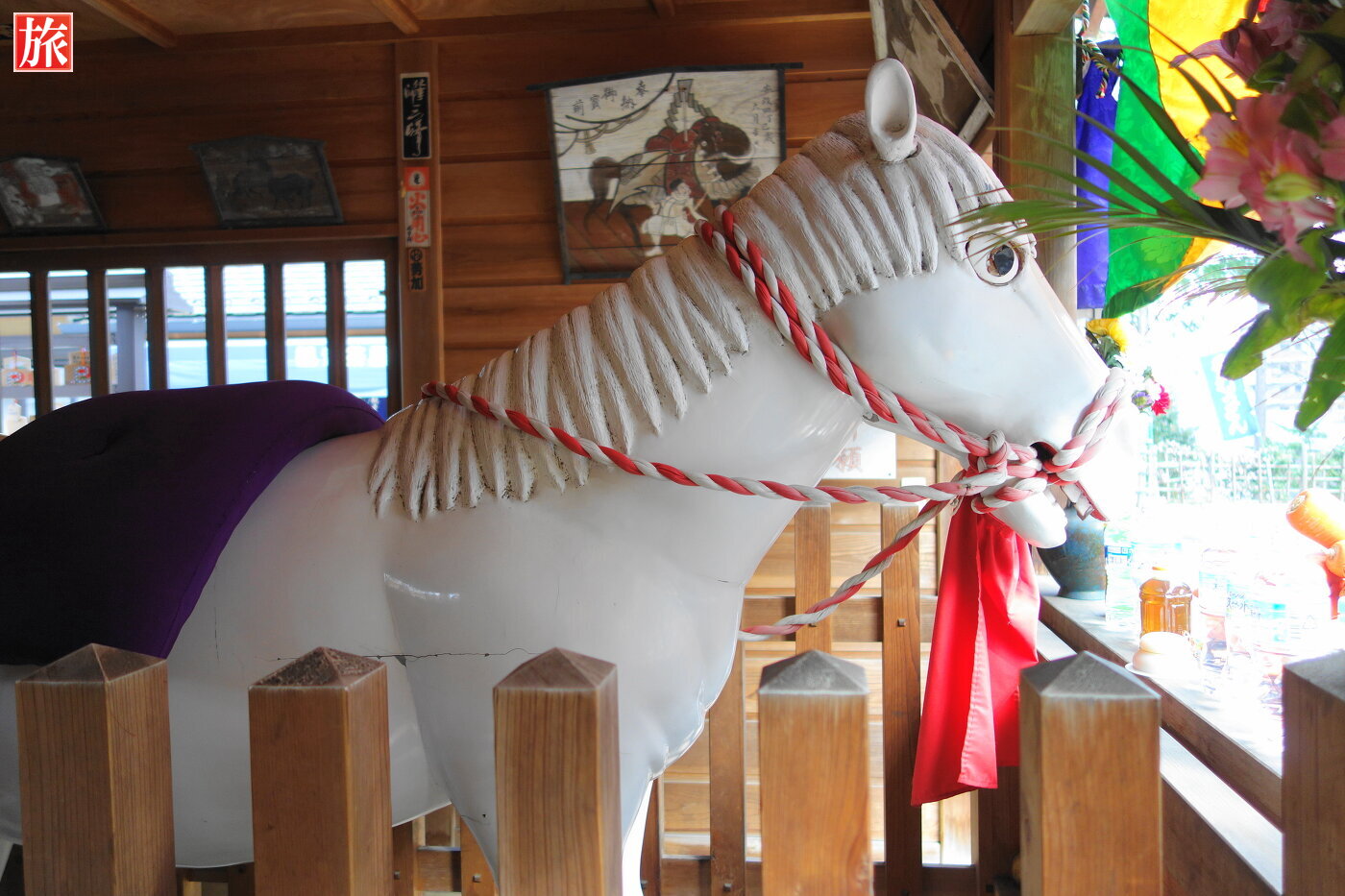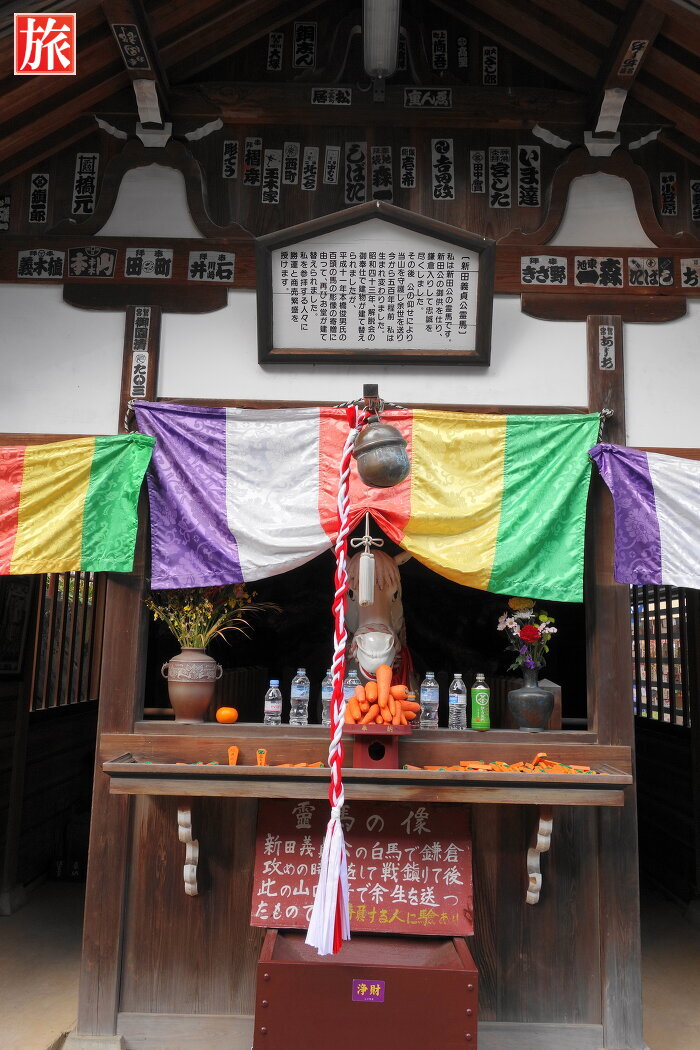 義貞霊場堂。新田義貞公奉納馬の白い木馬があります。今年はうま年ともあって参拝者は例年より多そうです。説明には勝負・商売繁盛を授かるとあります。堂の中には木に彫られた多数(100頭)の馬がいます。山口観音は新田義貞公が鎌倉攻め「幕府を滅ぼし、天皇をお護りする」の際に戦勝祈願を行った寺とのことです。