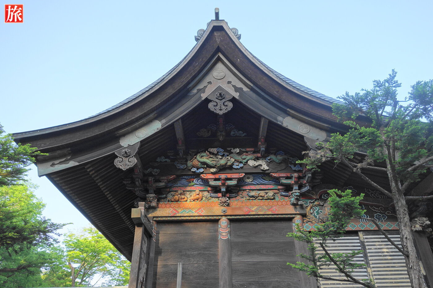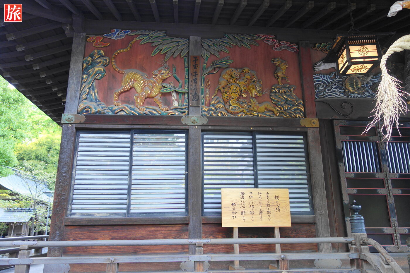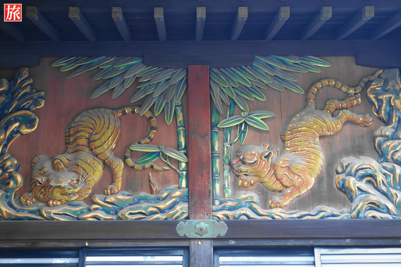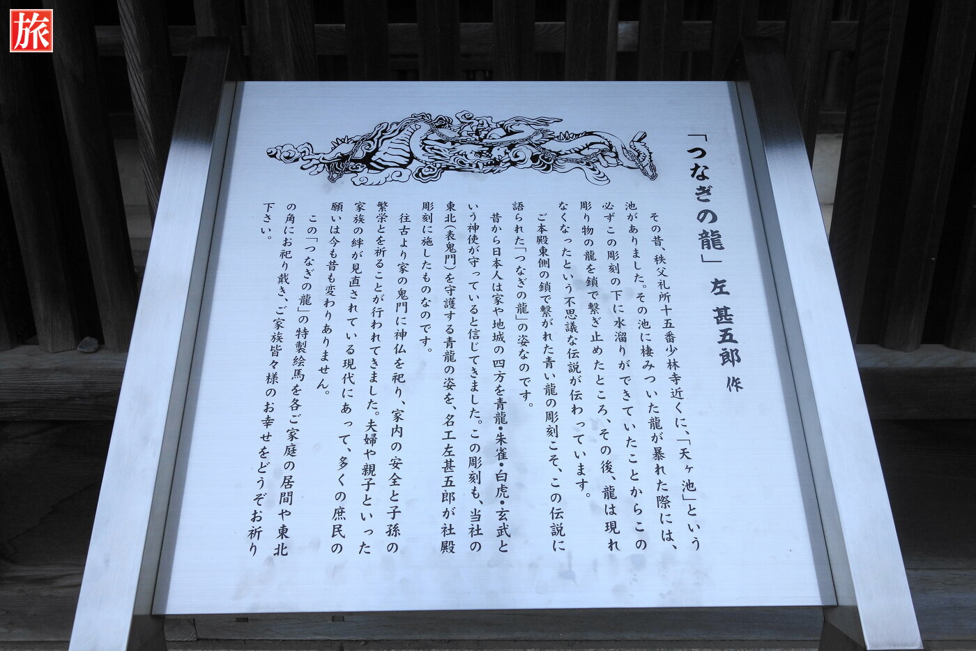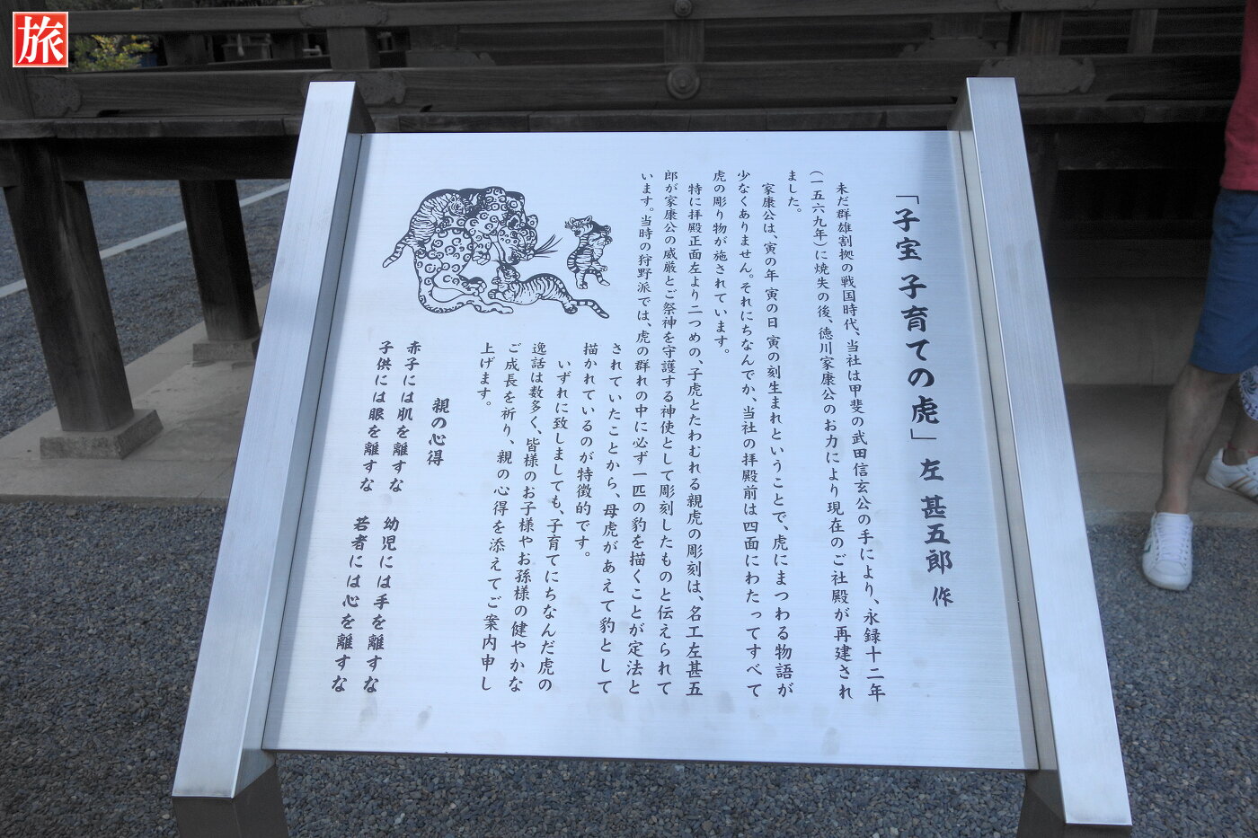 左 甚五郎作の「子育ての虎」。「赤子には肌を離すな、幼児には手を離すな、子供には目を離すな、若者には心を離すな」と親の心得が書いてありました。子育ての虎の説明板。本殿を右手から見た様子。本殿の右屋根の下に施された 左 甚五郎作「つなぎの龍」。青龍の姿は躍動感がありました。伝説を持つ「つなぎの龍」の説明板。