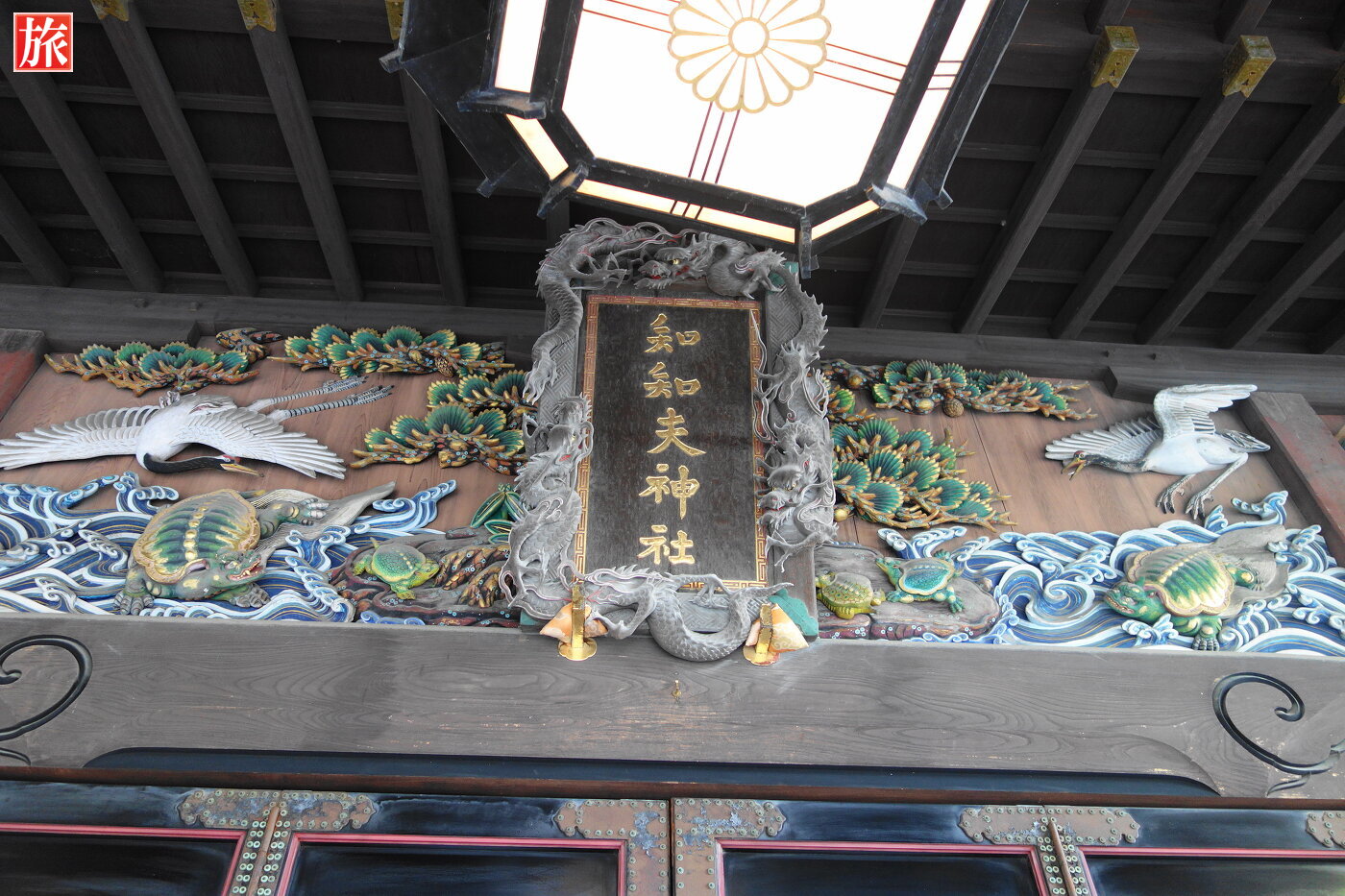 社殿は徳川家康による造営で、本殿・幣殿・拝殿が1つにまとめられた権現造。知知夫神社と書かれた社額。
