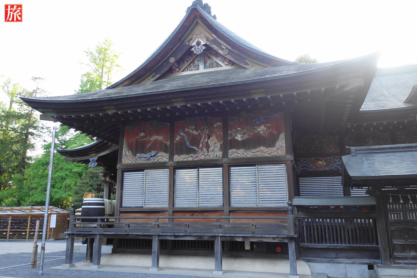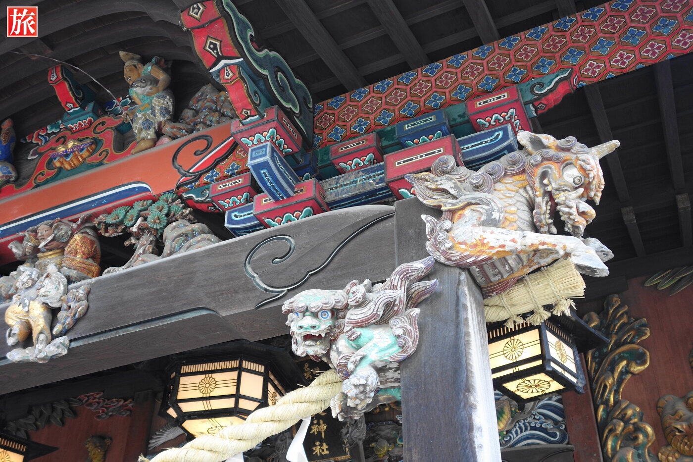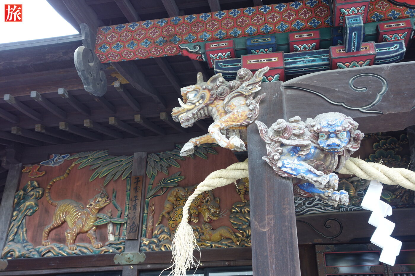 西側の緑色の龍は鎖で繋がれていません。「瓢箪から駒」についての説明。あちらこちらに彫刻が施されています。秩父宮妃歌碑。豊受大神宮。諏訪社御柱。