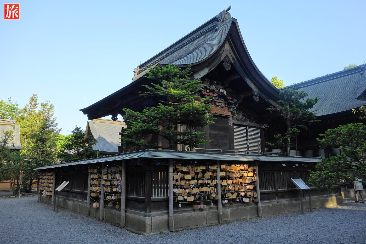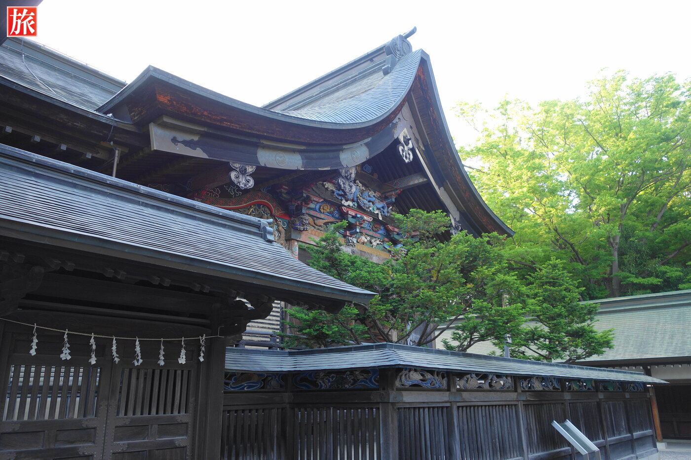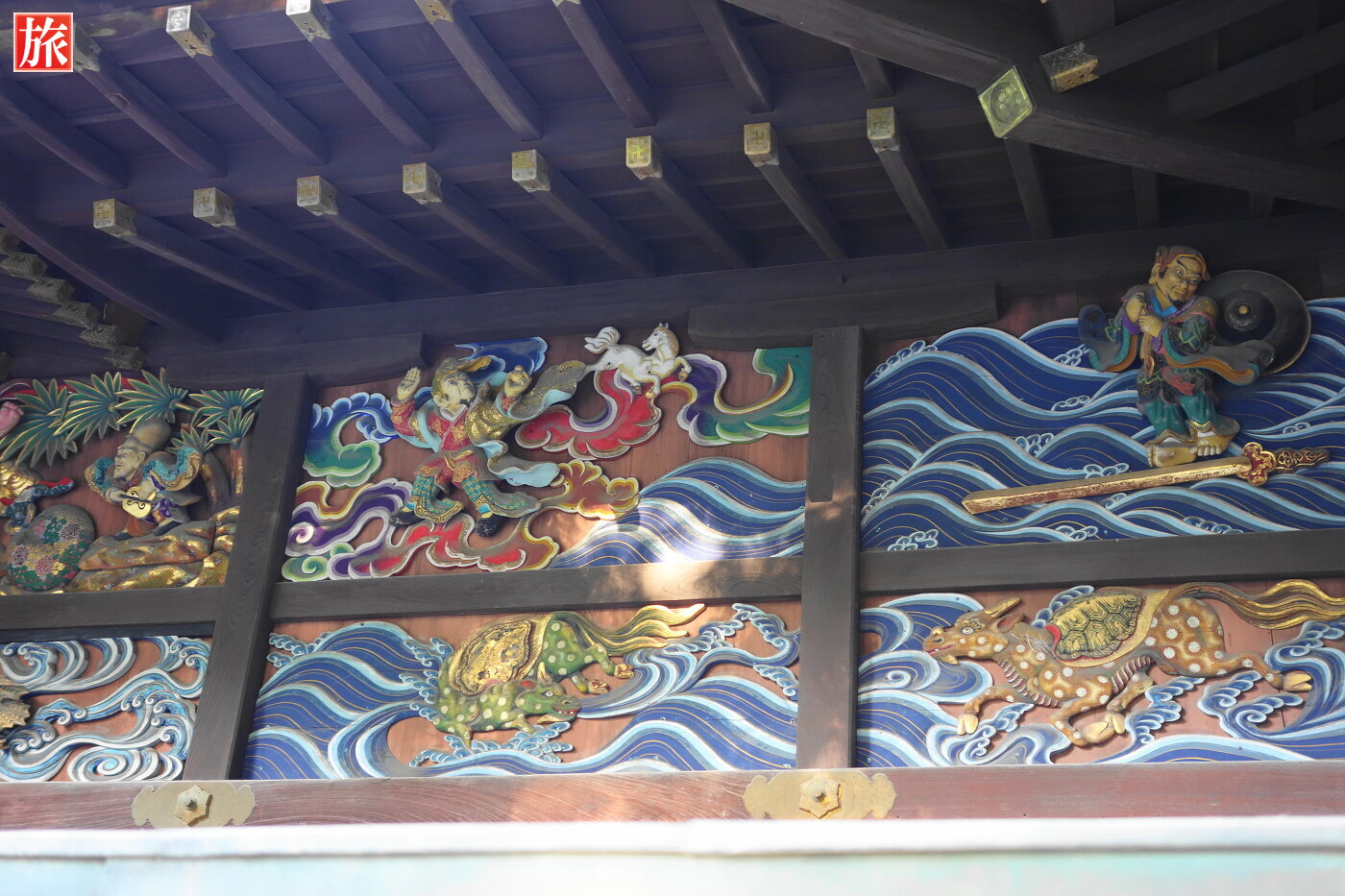 西側の緑色の龍は鎖で繋がれていません。「瓢箪から駒」についての説明。あちらこちらに彫刻が施されています。秩父宮妃歌碑。豊受大神宮。諏訪社御柱。