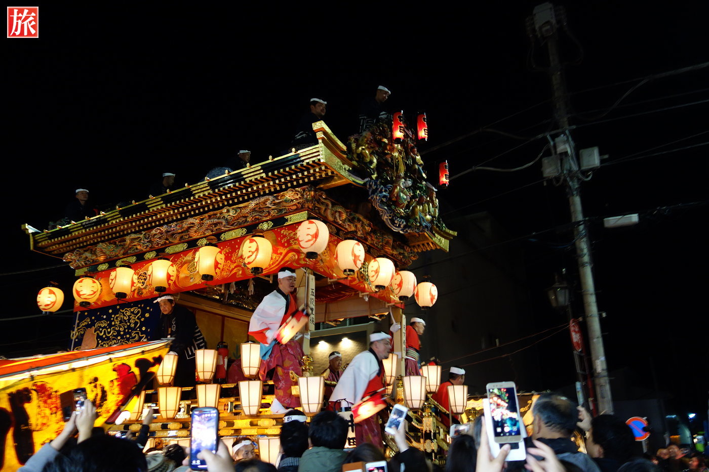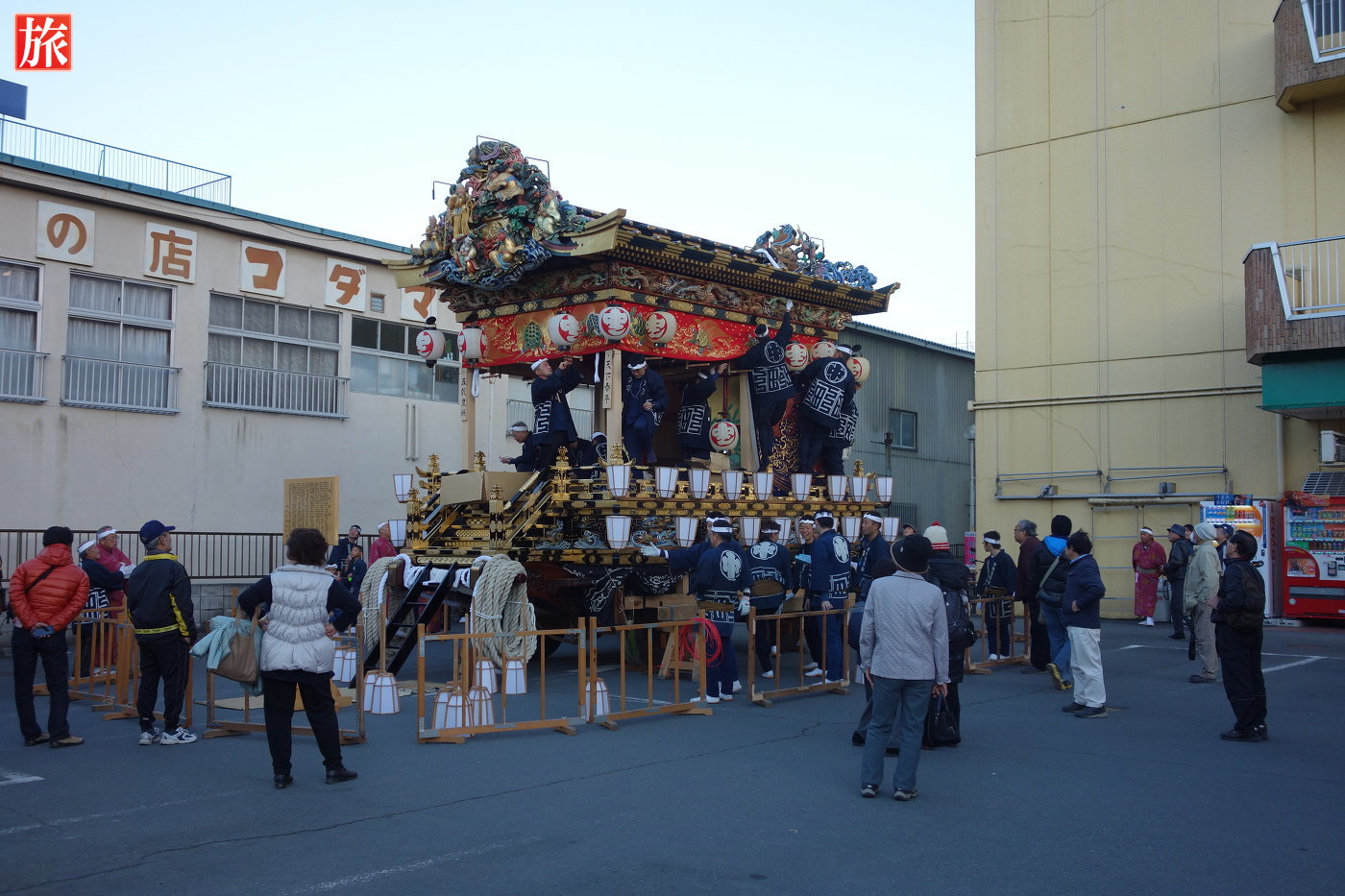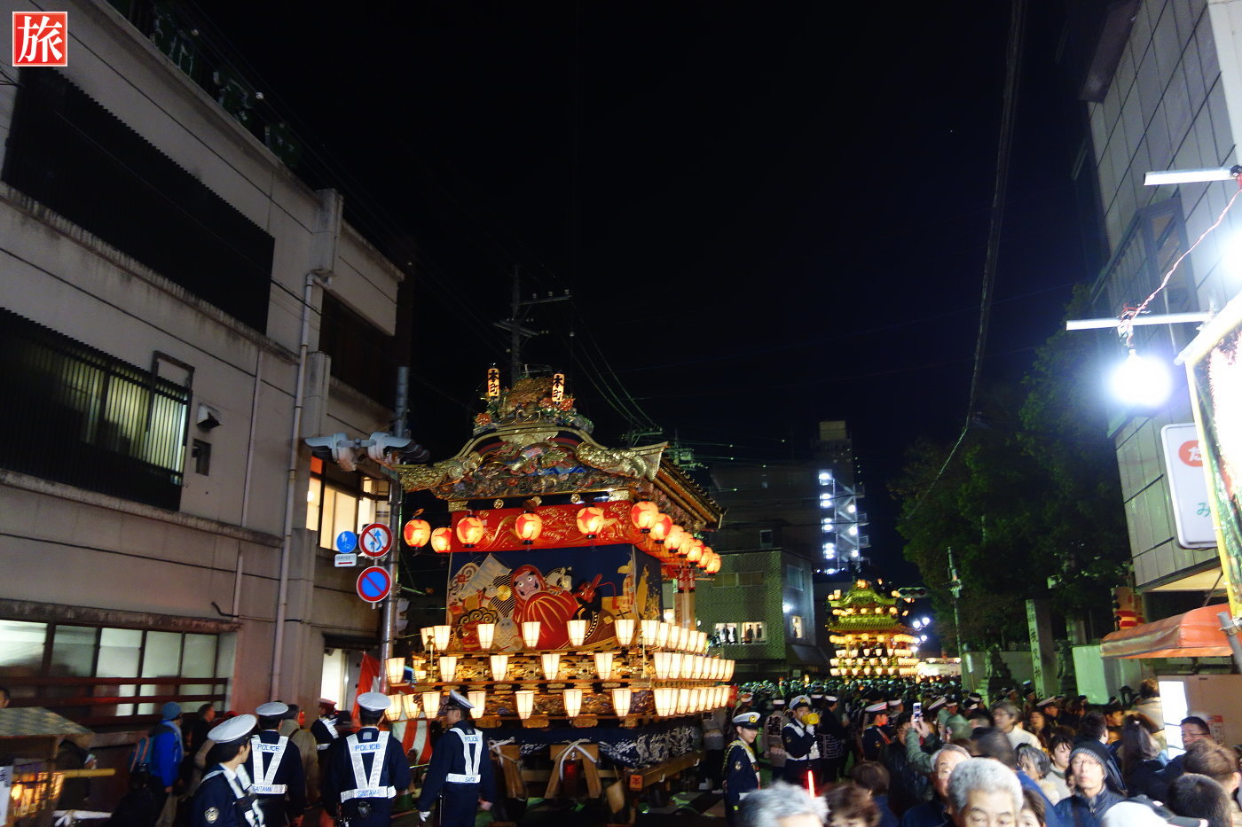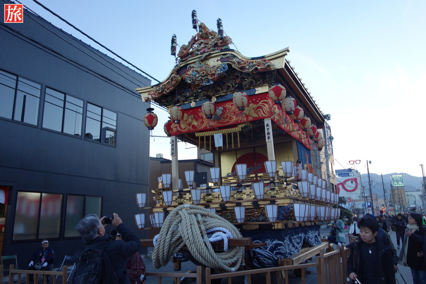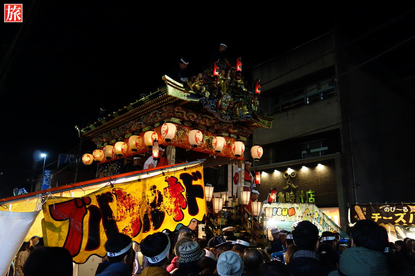 12月の例祭は 京都祇園祭、飛騨高山祭と共に日本三大曳山祭の1つとして有名です。今日は宵宮(よいみや)で朝から山車の曳きまわしが行われ山車、4基が市内を曳行します。明日の大祭(たいさい)では朝から山車の曳きまわしが行われ、6基の山車が勢ぞろいします。
