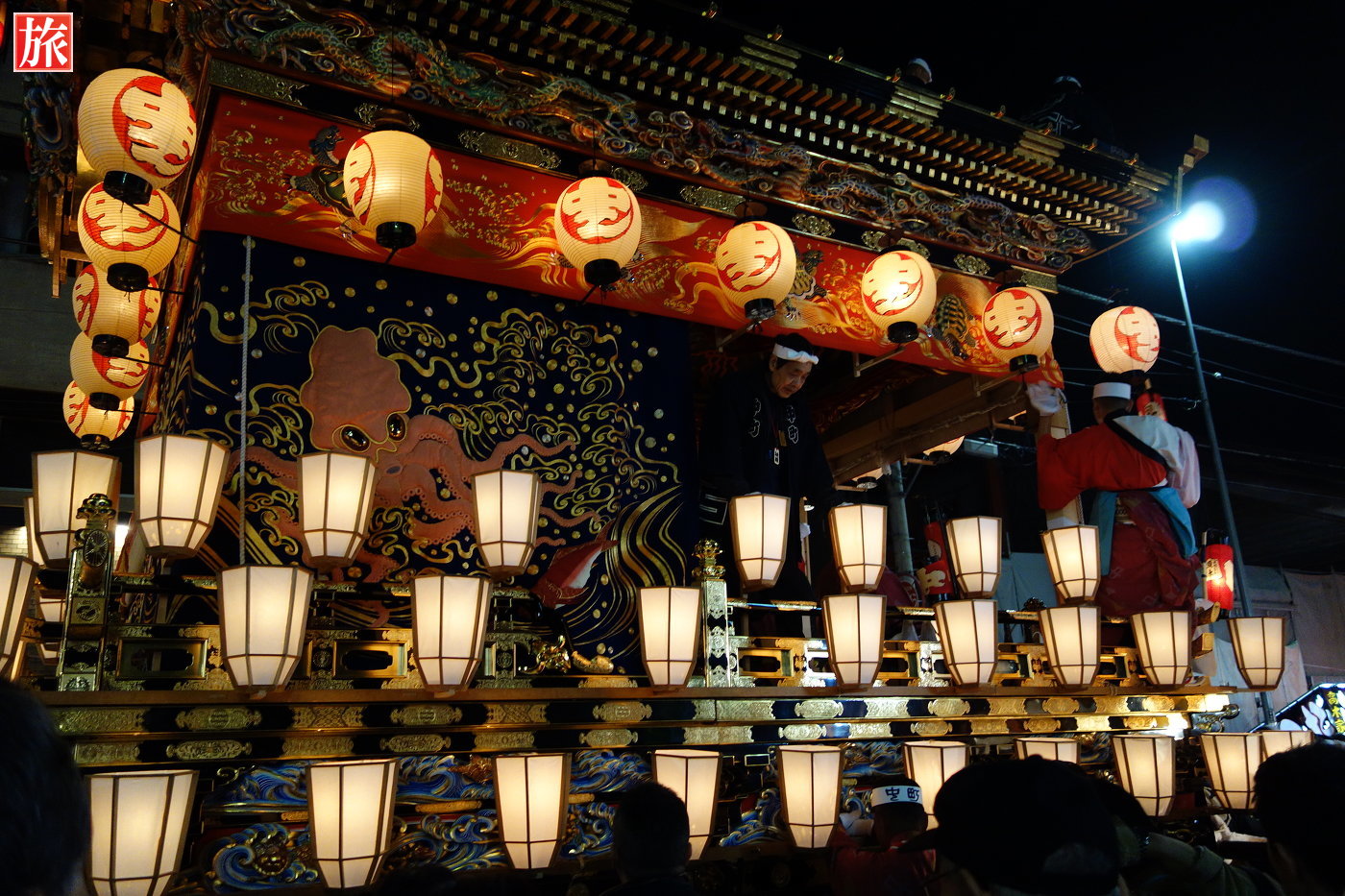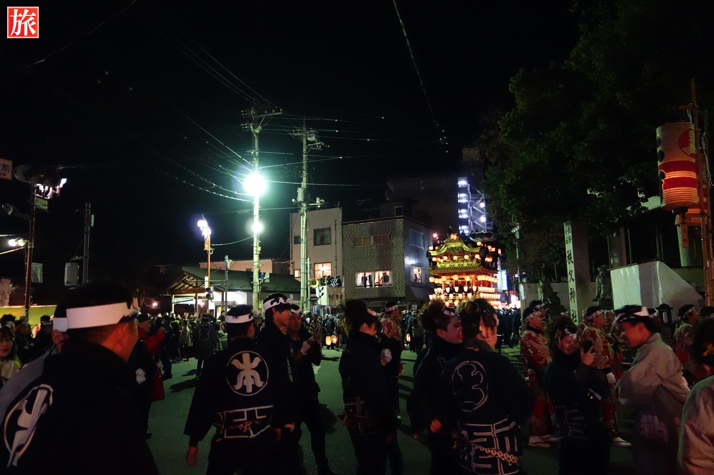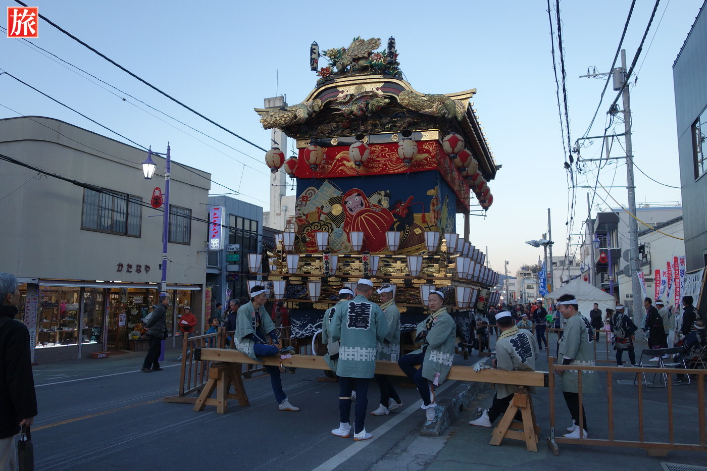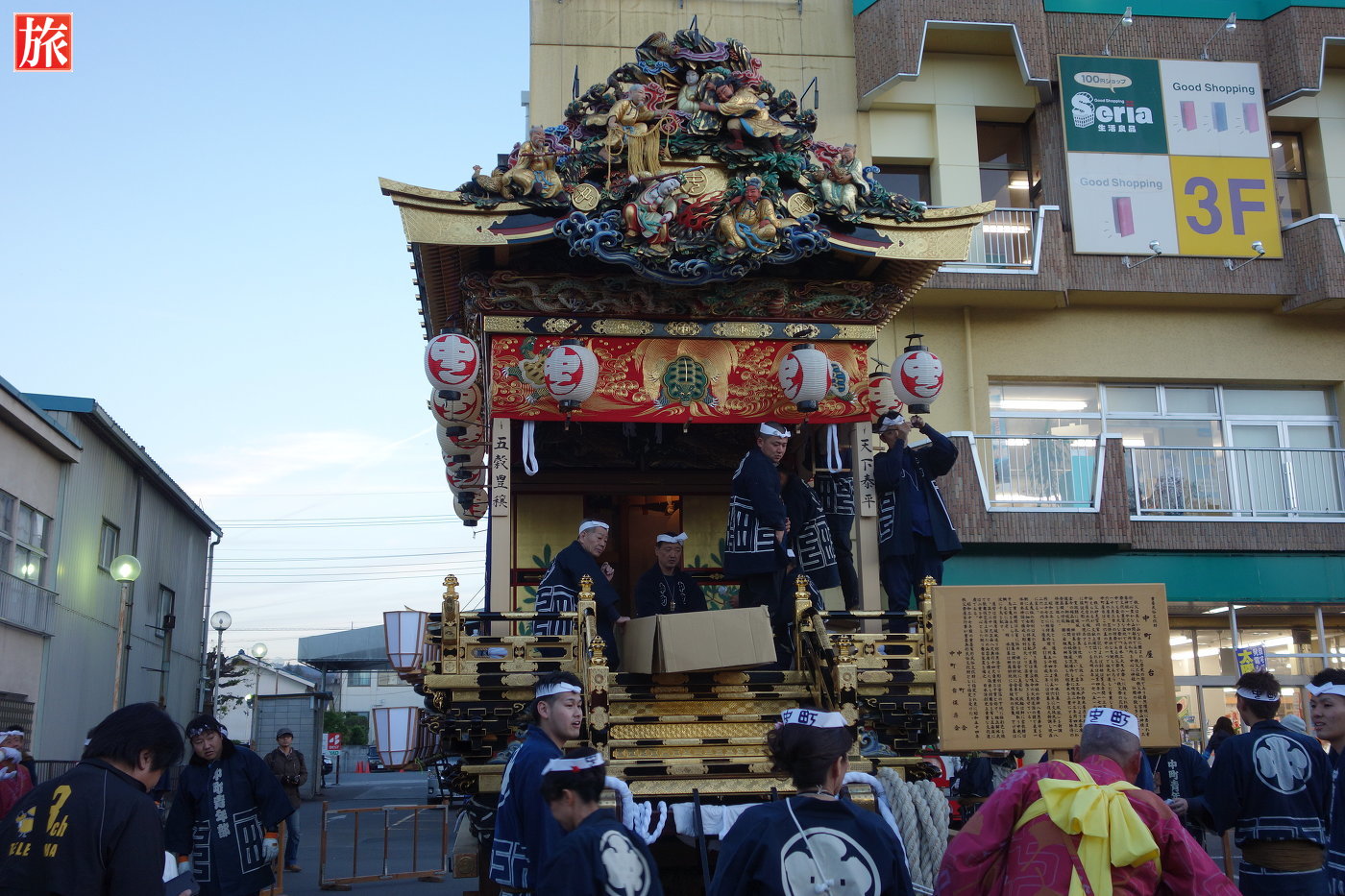 12月の例祭は 京都祇園祭、飛騨高山祭と共に日本三大曳山祭の1つとして有名です。今日は宵宮(よいみや)で朝から山車の曳きまわしが行われ山車、4基が市内を曳行します。明日の大祭(たいさい)では朝から山車の曳きまわしが行われ、6基の山車が勢ぞろいします。