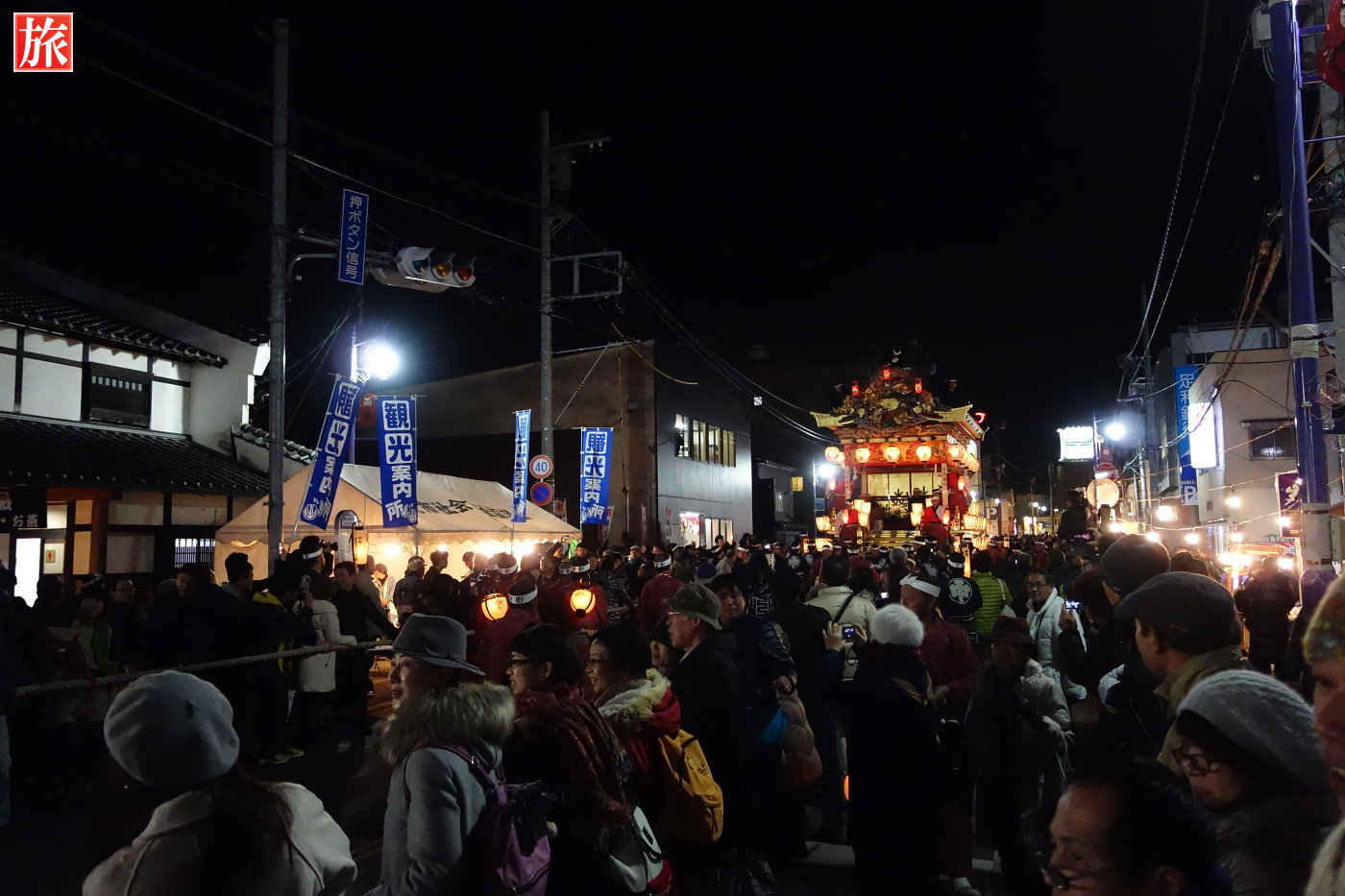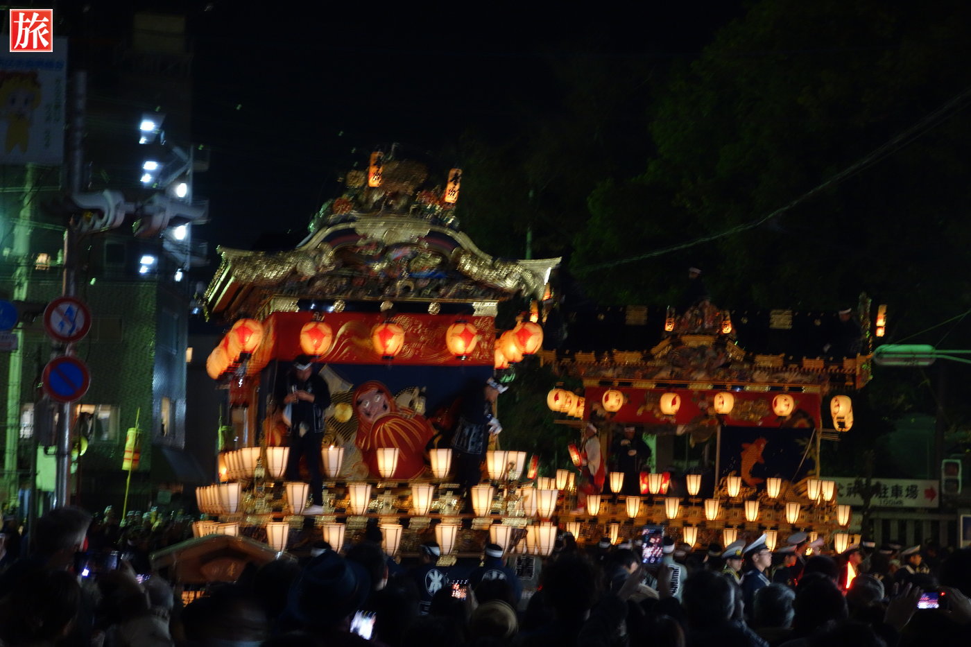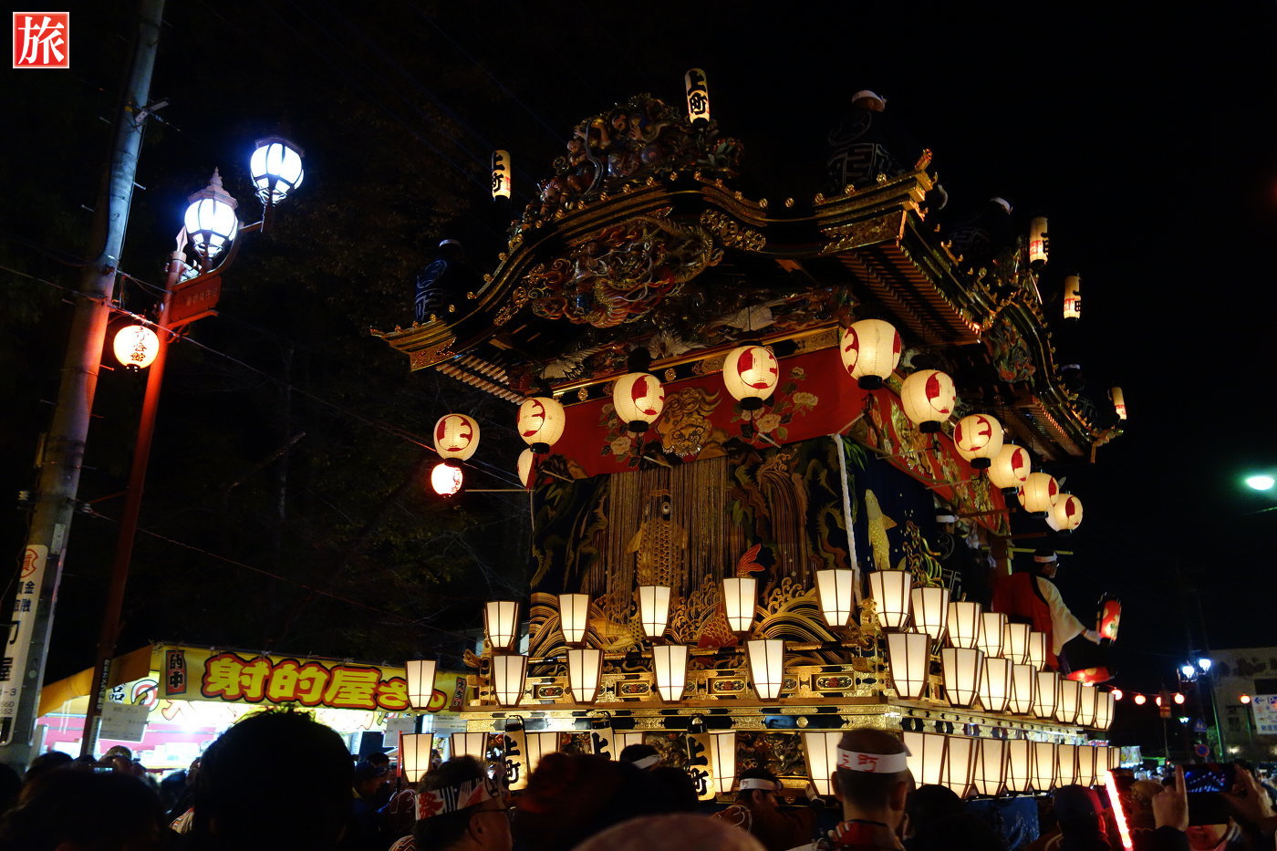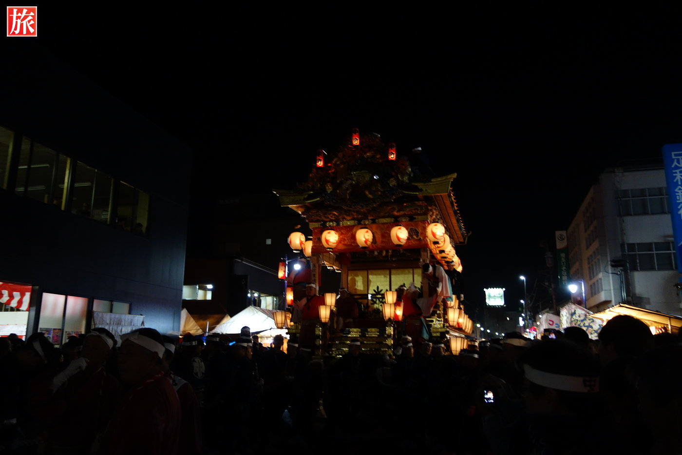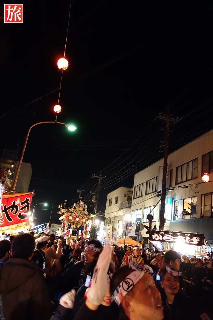 12月の例祭は 京都祇園祭、飛騨高山祭と共に日本三大曳山祭の1つとして有名です。今日は宵宮(よいみや)で朝から山車の曳きまわしが行われ山車、4基が市内を曳行します。明日の大祭(たいさい)では朝から山車の曳きまわしが行われ、6基の山車が勢ぞろいします。