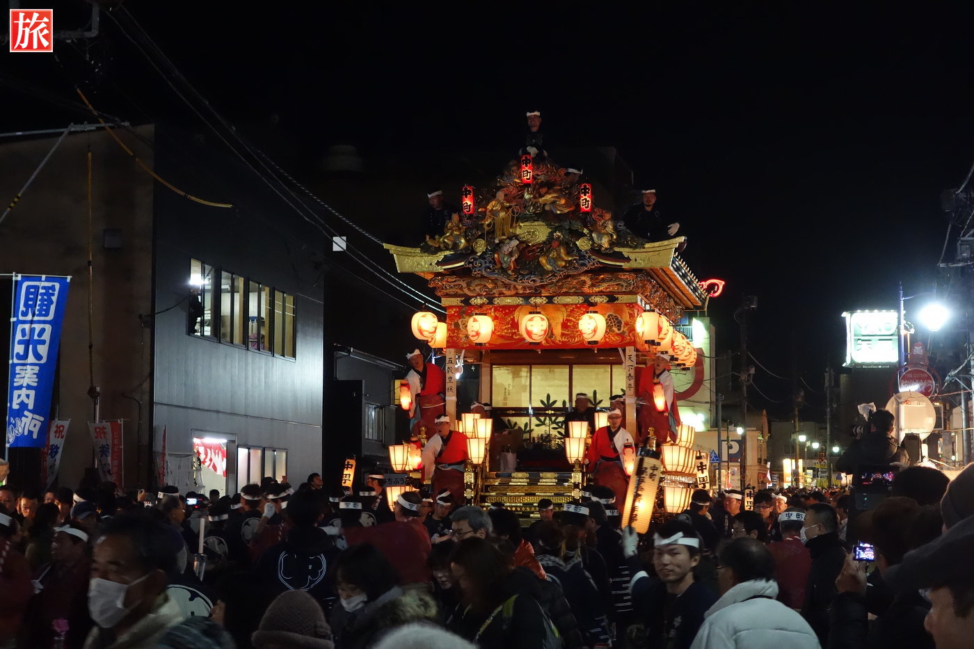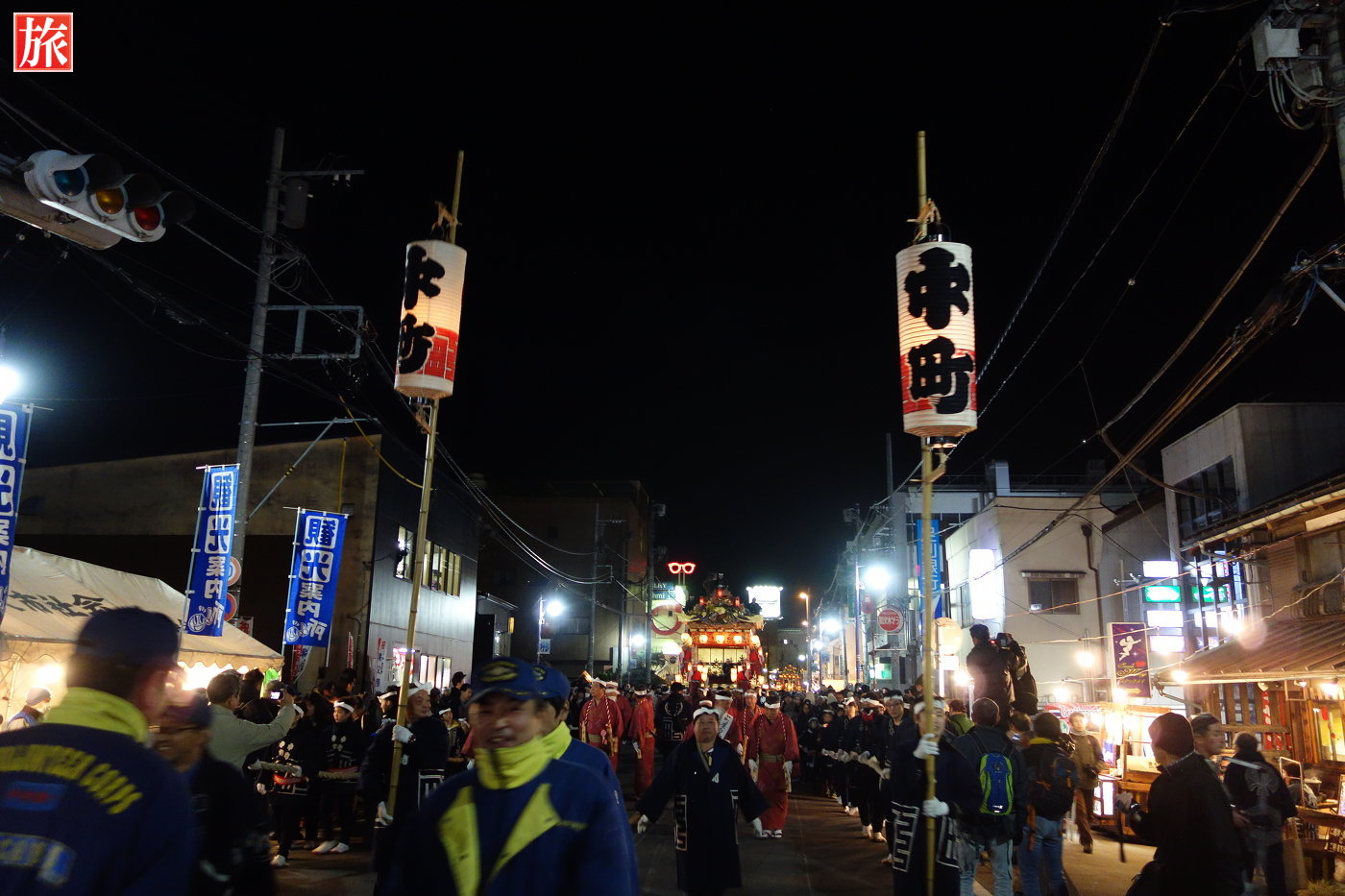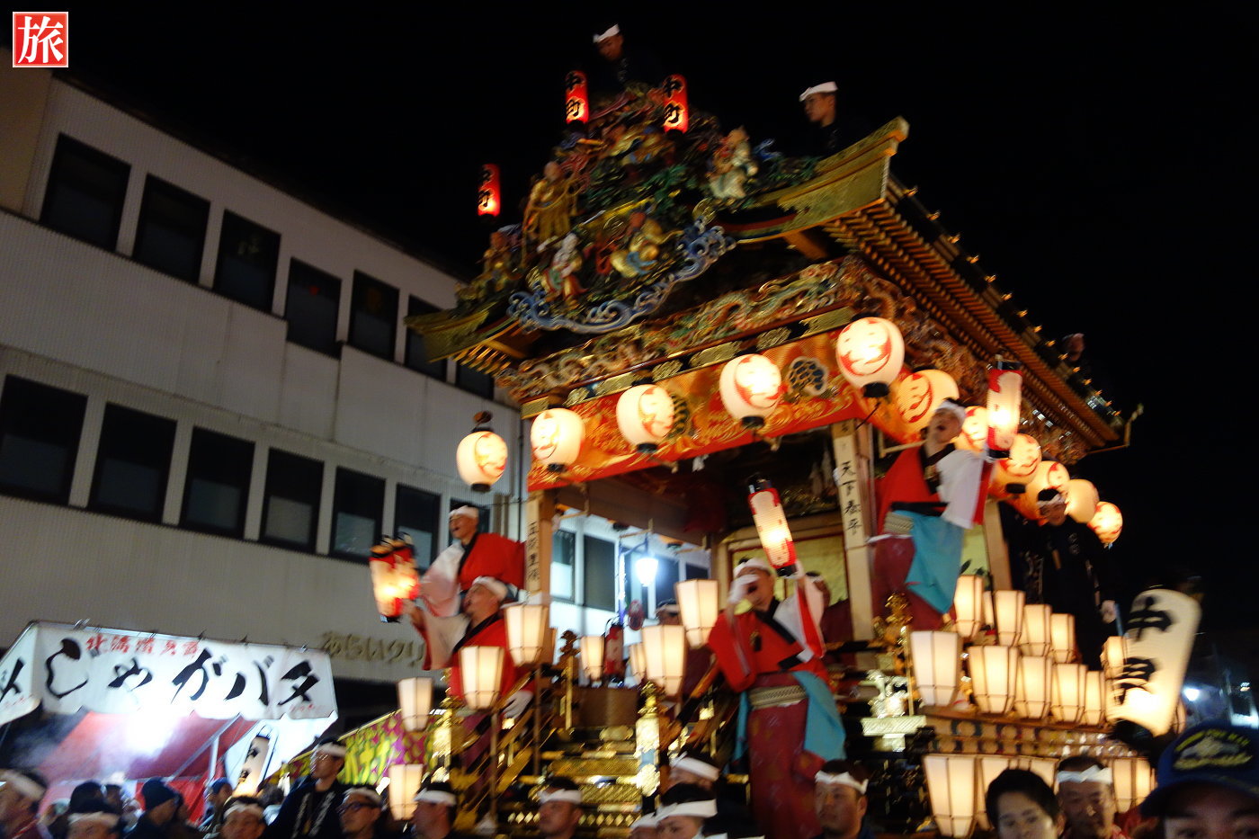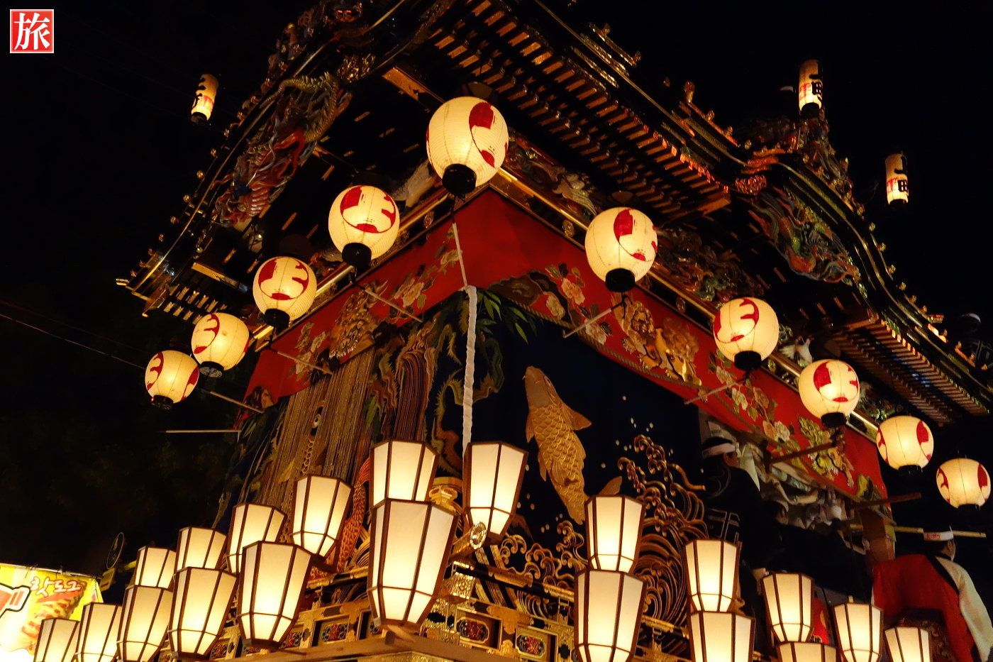 12月の例祭は 京都祇園祭、飛騨高山祭と共に日本三大曳山祭の1つとして有名です。今日は宵宮(よいみや)で朝から山車の曳きまわしが行われ山車、4基が市内を曳行します。明日の大祭(たいさい)では朝から山車の曳きまわしが行われ、6基の山車が勢ぞろいします。